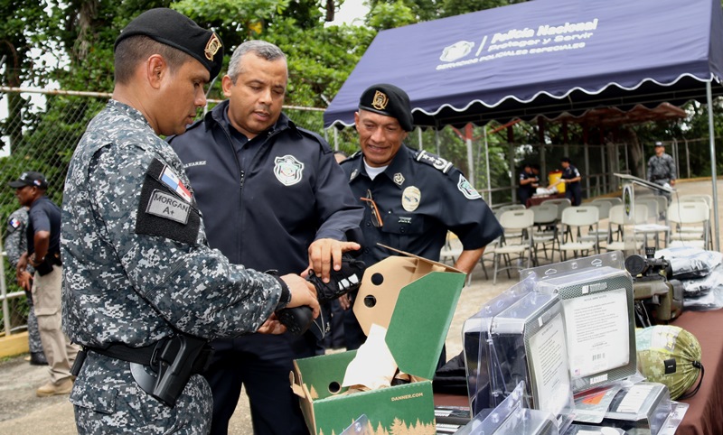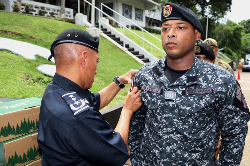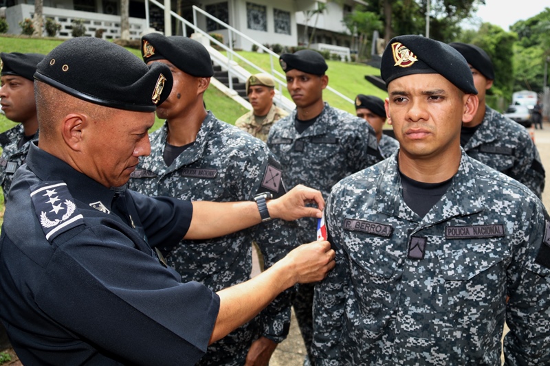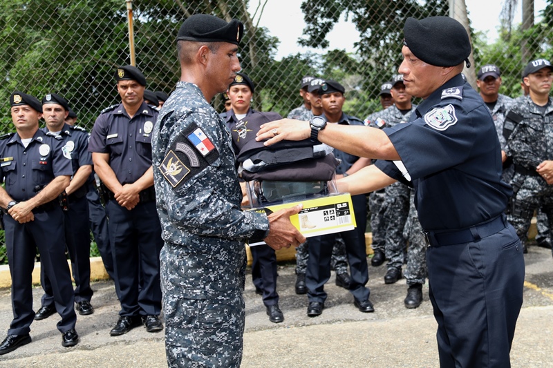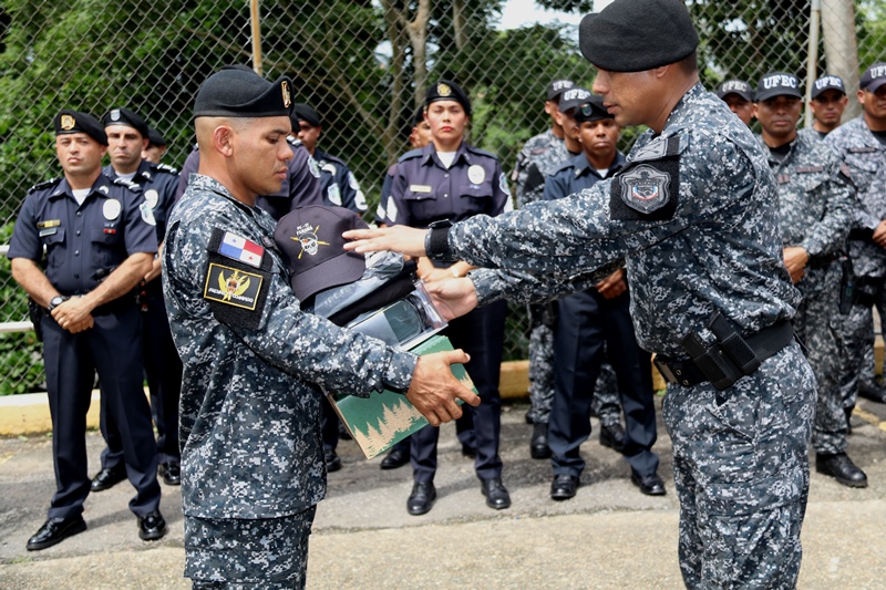 El capitán Michael Cueto, de la Unidad de Fuerzas Especiales y Contraterrorismo (UFEC) recibió de manos del Director Nacional de Servicios Policiales Especiales (Dinaspe), Javier Rodríguez la Bandera Nacional que será llevada a Paraguay, país donde 7 unidades de la Policía Nacional y un miembro del Servicio Nacional Aeronaval, representarán a Panamá en la XIII edición de Fuerzas Comando 2017. Durante la ceremonia también se entregó las escarapelas y equipos que serán utilizados en las diversas pruebas terrestres, aéreas y acuáticas que se realizarán desde el 17 al 27 de julio en diferentes lugares del país sureño. Rodeados de los buenos deseos de sus compañeros, el comisionado Javier Rodríguez felicitó al equipo por haber logrado la importante distinción de ser parte de esta experiencia. “Su profesionalismo y deseos de superación los ha llevado jejos y de seguro dejaran en alto al país y a nuestras instituciones de seguridad”, dijo Rodríguez. Estas unidades se han preparado para desenvolverse en diferentes escenarios, que ponen a prueba el entrenamiento al que son sometidos para ser parte de esta unidad elite de la Policía Nacional. El equipo que representará a Panamá está conformado por los mejores, quienes fueron seleccionados en competencias interinstitucionales en las que demostraron su alto rendimiento y agilidad, necesario para participar en competencias de este tipo en las que se les exige sus capacidades físicas, de concentración y destrezas. Unidades especiales de los estamentos de seguridad de más de 20 países de Latinoamérica serán parte de este evento que medirá las capacidades y niveles de preparación para enfrentar diferentes situaciones de riesgo, y otorgar los puntos que posesionará a cada equipo e institución proveniente como los mejores, convirtiéndolos en referentes en la región. Pruebas de asalto, tiros de alta precisión, franco tiro, tiro de oportunidades en diferentes distancias y operaciones combinadas, son parte de las pruebas que tendrán que vencer. Fuerzas Comando es una competición que se realiza anualmente desde el 2004 entre las Fuerzas Especiales de países latinoamericanos y otros invitados para la ocasión, y para el próximo año se tiene previsto que la sede sea Panamá.