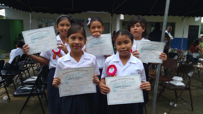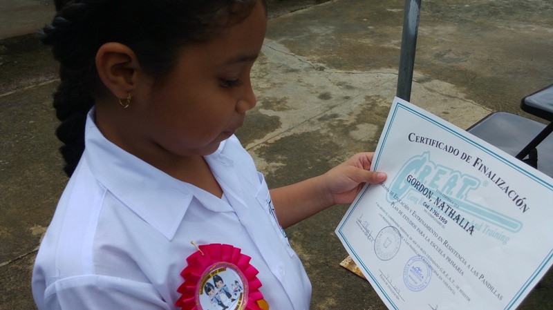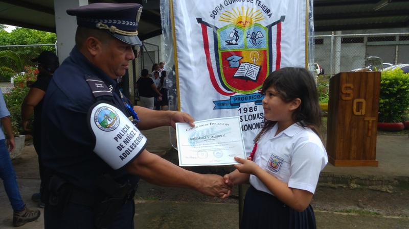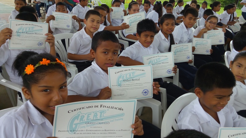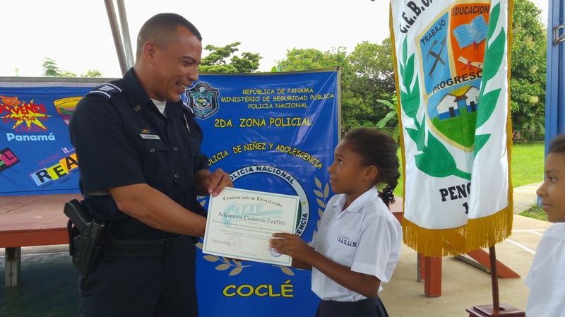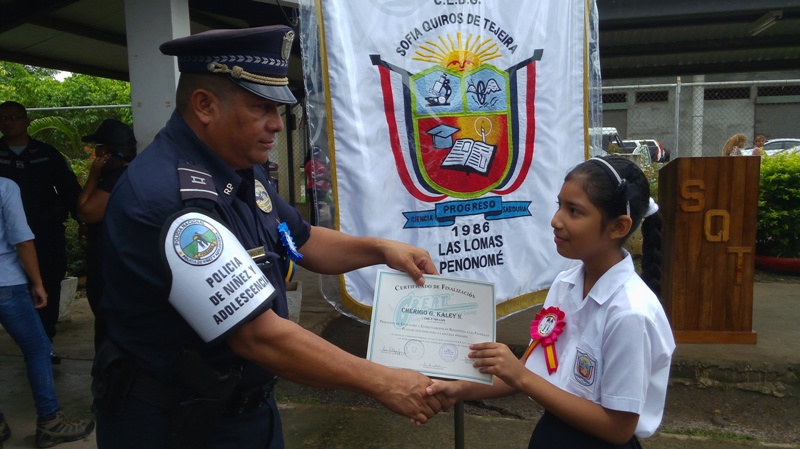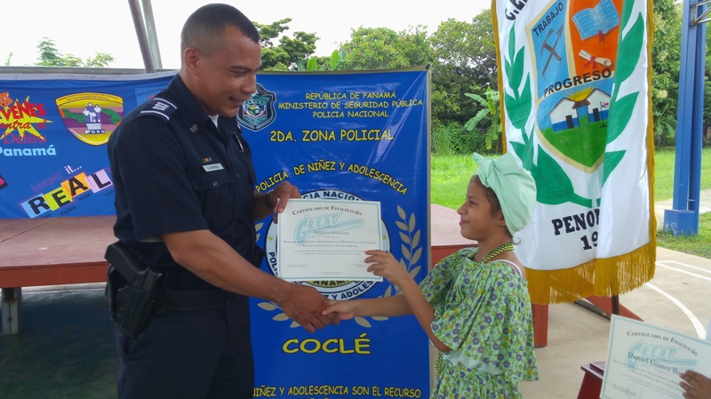 Unos 129 estudiantes en la provincia de Coclé se graduaron del programa Educación y Entrenamiento en Resistencia a las Pandillas (G.R.E.A.T.) que lleva adelante de la Policía Nacional, en las escuela Sofía Quirós de Tejeira y el C.B.G. Llano Marín en Penonomé. El teniente Ismael González resaltó la importancia de este programa que hasta la fecha ha graduado 866 estudiantes en lo que va del periodo escolar 2017, aun faltando 3,390 estudiantes por graduar en distintas planteles escolares de la provincia. Las graduaciones contemplaron bailes folklóricos, presentaciones de los congós, interpretaciones de mejorana y contaderas alusivas al desarrollo del programa G.R.E.A.T. de la Policía Nacional en las escuelas. Se realizaron entrega de certificado de culminación de reconocimientos a estudiantes que se desempeñaron en el curso como el niño Irving Grael del IV grado de la escuela Sofía Quirós de Tejeira, a Yahara Arrocha del VI grado de la escuela de Llano Marín y a los instructoras del curso la Cabo Cindy Gutiérrez y la cabo Eira Villagra en Penonomé. Yahara Arrocha alumna del VI grado, agradeció en nombre de todos sus compañeros a los miembros de la Policía Nacional principalmente a la cabo Cindy Gutiérrez por todos los conocimientos adquiridos en el curso que serán puestos en práctica dentro del plantel, comunidad para seguir siendo estudiantes modelo para la sociedad y reproducir a nuestros amigos y vecinos los contenidos de los talleres, y poder decir " NO A LAS DROGAS Y PANDILLAS. A estos actos de graduaciones asistieron autoridades de la provincia como el Ingeniero Rommel Quirós, la licenciada Isis Joseph Juez de Niñez y Adolescencia, Profesor Jorge González supervisor del Ministerio de Educación Penonomé, el capitán Jorge Sánchez encargado de área A Penonomé, teniente Ismael González encargado de Niñez y Adolescencia de la Zona de Coclé, directores de las escuelas profesor Juan Rodríguez, profesora Marisol Coronado y la administrativos y el público en general que acompañaron a estos actos.