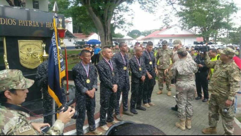 El equipo de la Policía Nacional conformado por unidades de la Dirección de los Servicios Policiales Especiales se llevaron el tercer lugar en la competencia “Soldado de Titanio”, llevada a cabo este martes 15 de agosto en conmemoración al 9° aniversario del Servicio Nacional Aeronaval (SENAN). Esta competencia en la que participaron seis unidades policiales, constó de varios circuitos, iniciando con la natación de 700 metros uniformados, en la playa de Veracruz. Luego cada uno de los equipos tomó un zodiac y remaron 1000 metros ida y vuelta, al salir del agua tomaron una bicicleta e hicieron un recorrido de 35 kilómetros, durante camino realizaron 10 disparos a una silueta que se encontraba a 25 metros de distancia. Al finalizar el ciclismo, tomaron una mochila con un peso de 35 libras y un fusil y realizaron una marcha de 10 kilómetros por una trocha y carretera, hasta llegar a la meta en las instalaciones del Servicio Nacional Aeronaval. En esta segunda edición de “Soldado de Titanio”, participaron 4 equipos representando a cada uno de los estamentos de seguridad. |