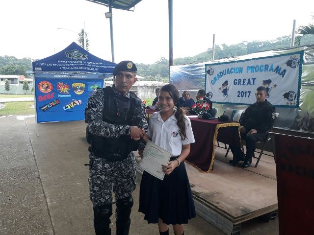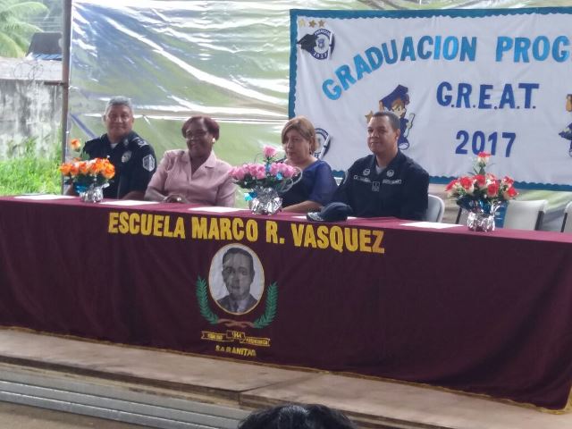 Un total de 180 estudiantes de la escuela Marcos Ramón Vásquez, ubicada en el corregimiento de Sabanitas, en la provincia de Colón, culminaron con éxito el programa preventivo GREAT, que les enseña a decirle NO a las pandillas y a la violencia. Los niños que durante tres meses fueron capacitados por unidades de la Policía de la Niñez y Adolescencia sobre diversos temas como el no dejarse influenciar por personas extrañas que busquen introducirlos con las pandillas. El Comisionado y Ejecutivo de la Zona de Policía de Colón, Alexis Muñoz, felicitó a los estudiantes y los exhortó a poner en práctica lo aprendido, así como decirles a sus padres y maestros si alguna persona les habla de pertenecer a una pandilla. En lo que va del 2017, en la provincia de Colón, más de 1,500 estudiantes han sido instruidos en el programa preventivo GREAT. |