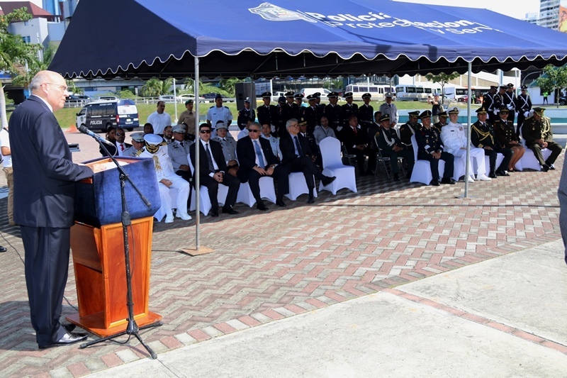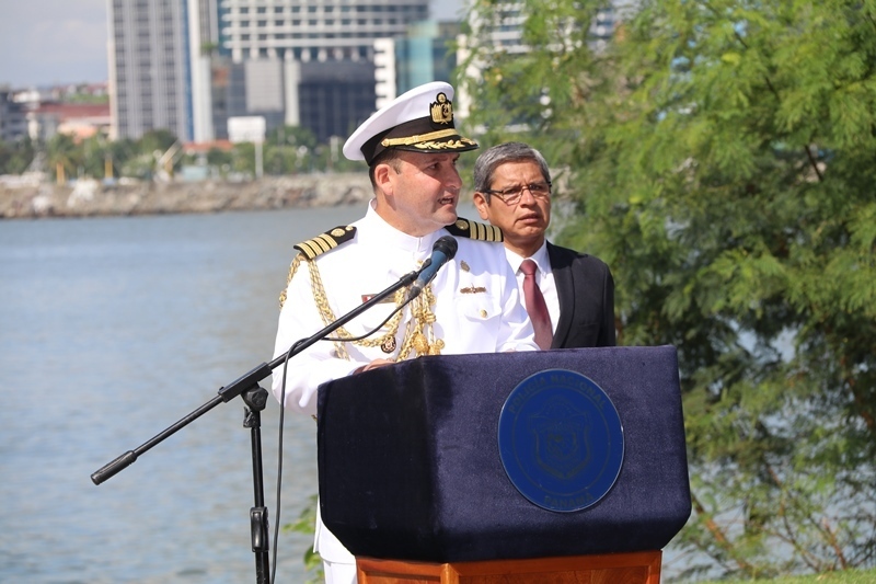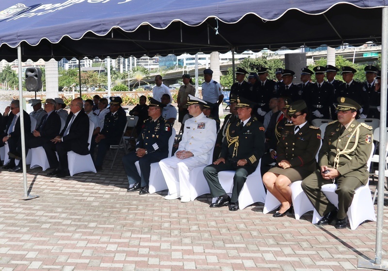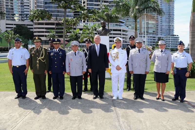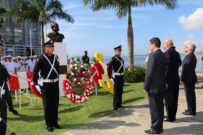 Miembros de la Policía Nacional, acompañaron a agregados navales de Perú acreditados en Panamá, durante las actividades realizadas en conmemoración del 196° aniversario de la Marina de Guerra del Perú y el 138° aniversario del Combate Naval de Angamos. Este jueves 12 de octubre en la Plaza de la Democracia ubicada en Paitilla, se colocaron las ofrendas florales ante al busto del Gran Almirante del Perú, Don Miguel Grau Seminario. En representación del Director General de la Policía Nacional, Omar Ariel Pinzón Marín, estuvieron presentes el Director Nacional de Operaciones, José Ríos; el Director Nacional de Ingeniería e Infraestructura, Juan Cerezo y la Mayor Luz Marina Sánchez, del Servicio de Sedes Diplomáticas. El Capitán de Navío Eduardo Enrique Neyra Ugarte, Agregado de Defensa de la Embajada del Perú en la República de Panamá, habló de la importancia de ambos eventos y agradeció a los presentes por su asistencia. En esta ceremonia también participaron los cadetes de la Escuela de Oficiales de Policía (ESOPOL), Doctor Justo Arosemena. |