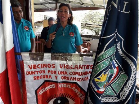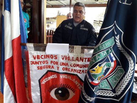 Con la finalidad de fortalecer las alianzas preventivas con la comunidad, las unidades del departamento de Seguridad Ciudadana de la 4ta. Zona Policial de Chiriquí, realizaron la inauguración del Programa Vecinos Vigilantes en la Urbanización Villa Esmeralda, ubicada en el distrito de Dolega. El evento inicio con las palabras de reflexión por parte de la Señora Rosario Tejada, mientras que la Maestra Daysi Villanueva, dio la bienvenida a todos los presentes. Por otro lado, El Teniente Hernán Beitia, del departamento de Seguridad Ciudadana, juramentó a los integrantes del Programa Vecinos Vigilantes de la Urbanización Villa Esmeralda. La Señora Yoly de la Lastra, Presidenta de este Programa, agradeció a la Policía Nacional por haberles dado la oportunidad de conocer este grupo, que va hacer de beneficio para la comunidad en cuanto a la seguridad. El Capitán Omar Espinoza, encargado del Área de Dolega, felicitó a todos los miembros de la junta directiva por tomar esta iniciativa de integrarse al programa, ya que la seguridad nos compete a todos. La develación de la lámina que los identificó como parte del programa Vecinos Vigilantes de la Urbanización Villa Esmeralda, estuvo a cargo del Capitán Omar Espinoza en compañía de los ciudadanos presentes.