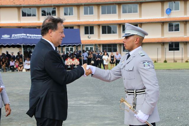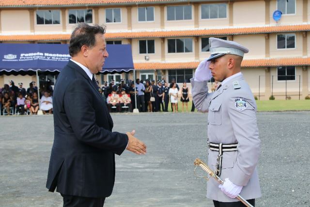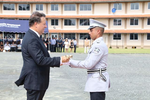 El presidente de la República, Juan Carlos Varela, instó hoy a los graduandos de los diferentes estamentos de seguridad a mantener en alto los principios de servicio eficiente a la comunidad y de prevención y combate al delito con respeto a los ciudadanos y la Ley. Durante el acto de graduación de la Escuela de Oficiales de Policía Dr. Justo Arosemena, el Mandatario destacó que su Administración seguirá apoyando a la institución policial y aportando los recursos para que cada día sea más profesional y mejor equipada para cumplir las funciones que le señala la Ley. “Quiero que sean responsables, respetuosos de la Ley, que den órdenes justas y apegadas a la Ley, que protejan siempre a nuestro pueblo, sus derechos e intereses y que sepan que sobre su espalda descansa el honor y futuro de la institución policial a la que sirven. Sean profesionales y justos; sacrificados y valientes”, expresó el Gobernante. Para el Mandatario, en cada graduación es importante resaltar el sacrificio y entrega de las unidades de la Policía Nacional, del Servicio Nacional de Fronteras, Servicio Nacional Aeronaval y del Servicio de Protección Institucional, por el bienestar y protección de sus conciudadanos y extranjeros. “En este siglo XXI, la profesión policial requiere las mentes más claras y competentes, porque el mundo experimenta las exigencias de la Revolución del Conocimiento, y todas nuestras estrategias implican competencias a tono con esa realidad”, destacó el Director General de la Policía Nacional, Omar Ariel Pinzón Marín. En la Promoción XVII, 77 culminaron su formación como oficiales y hoy recibieron su título de Licenciatura en Administración Policial. El pensum académico consiste en 56 materias, además de cursos en tácticas policiales, técnicas de protección a personas muy importantes, liderazgo, curso básico de inglés, seminario de protocolo, etiqueta y buenos modales, seminario de liderazgo e inteligencia impartido en la base del FBI en Virginia, Washington DC. Cuatro egresados de la XVII promoción obtuvieron calificaciones que los colocan en el capítulo de honor Sigma Lambda: Kevin Ardines- Primer puesto, Alexander Apolayo –Segundo puesto y Anayansi Silvera, en el tercero. Otra novedad es que dos oficiales provienen de la Academia de Cadetes Mayor General José Félix Rafael Hermidas González, de la Policía Nacional de República Dominicana. |