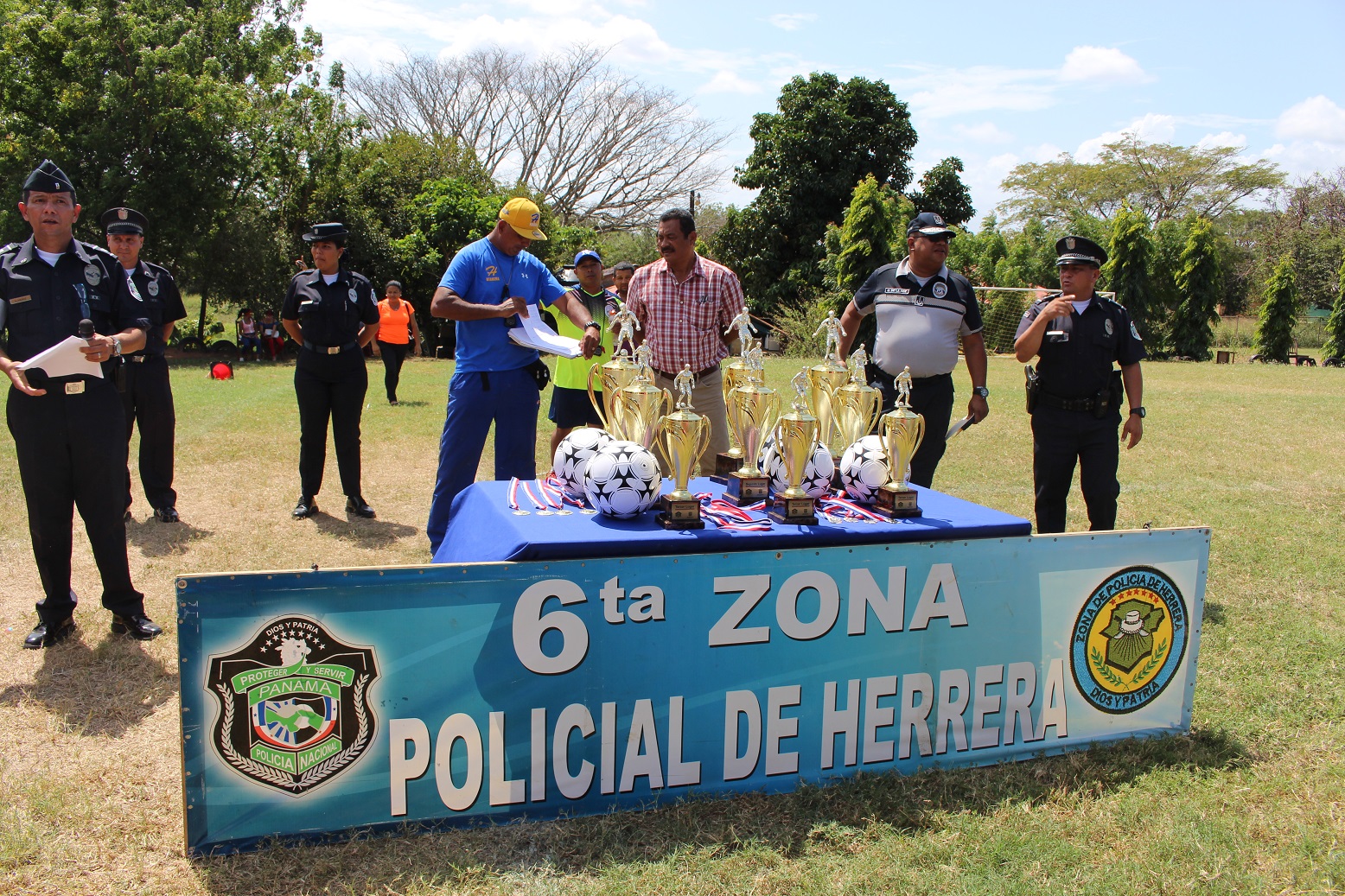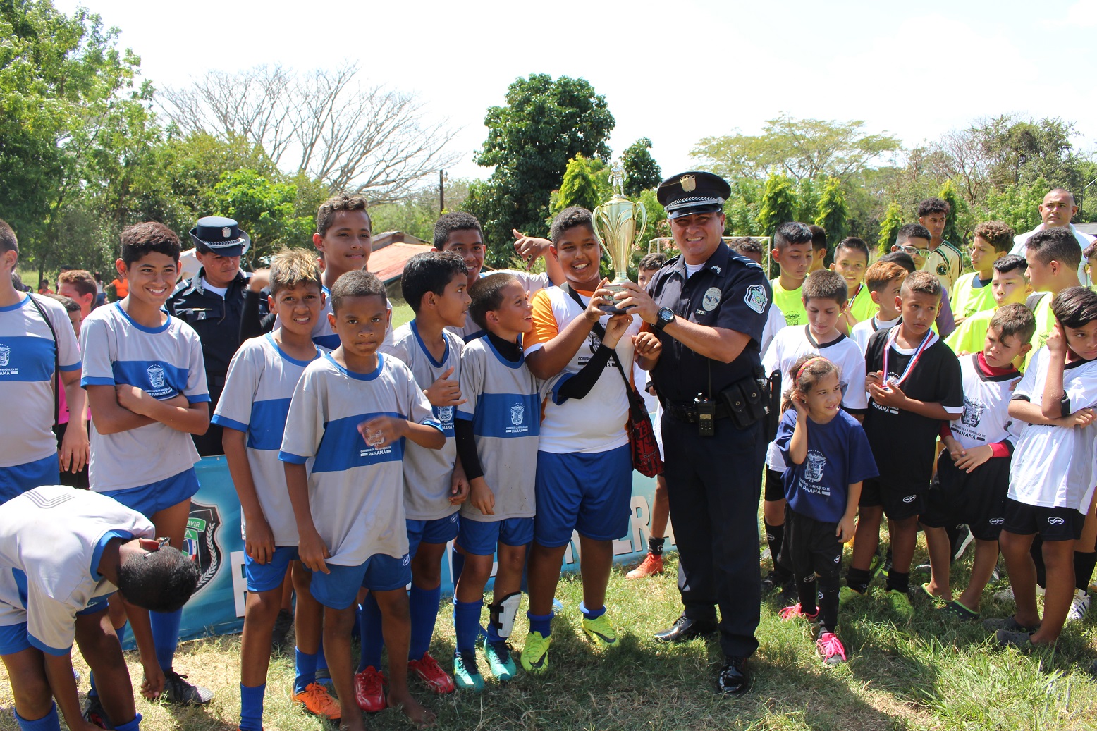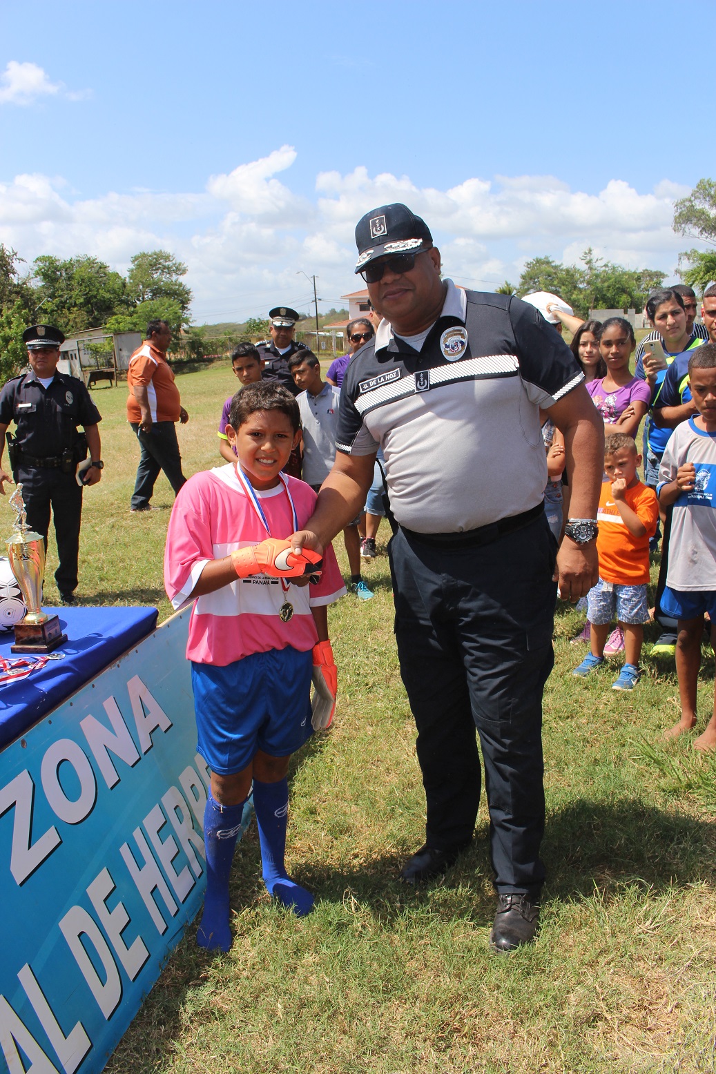 En la Cancha de Futbol de la Zona de Policía de Herrera, unidades policiales liderizada por el Comisionado Urraca de la Hoz; jefe de la 6ta. Zona Policial, celebraron la clausura de la Liga “Solo para Campeones”, donde participaron niños, niñas y adolescentes de diferentes edades. El Jefe policial se dirigió a los niños para felicitarlos por la conducta durante el desarrollo de todos los partidos, exhortarlos a seguir estudiando y los instó a poner en práctica las orientaciones impartidas por las unidades de la policía de la Niñez y Adolescencia durante el desarrollo de la liga como fueron las charlas sobre el uso correcto de las redes sociales, presión de grupo, prevención de droga y otros temas de seguridad. En el acto de premiación estuvo el Comisionado De La Hoz con su equipo de trabajo y funcionarios de Pandeportes, acompañando y entregando los trofeos, medallas y balones a los equipos y participantes más destacados en el torneo. Es preciso indicar que en la clausura hubo brindis y mucha diversión para todos los pequeños en sus vacaciones de verano. |