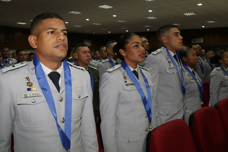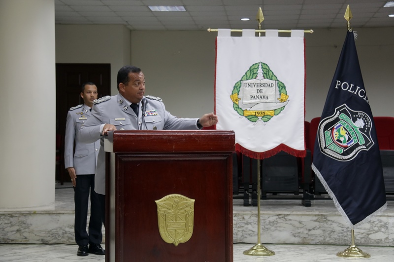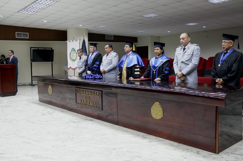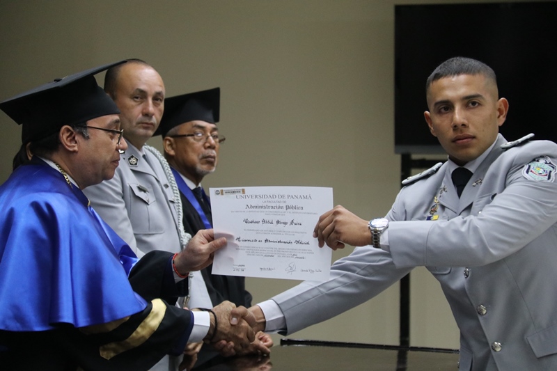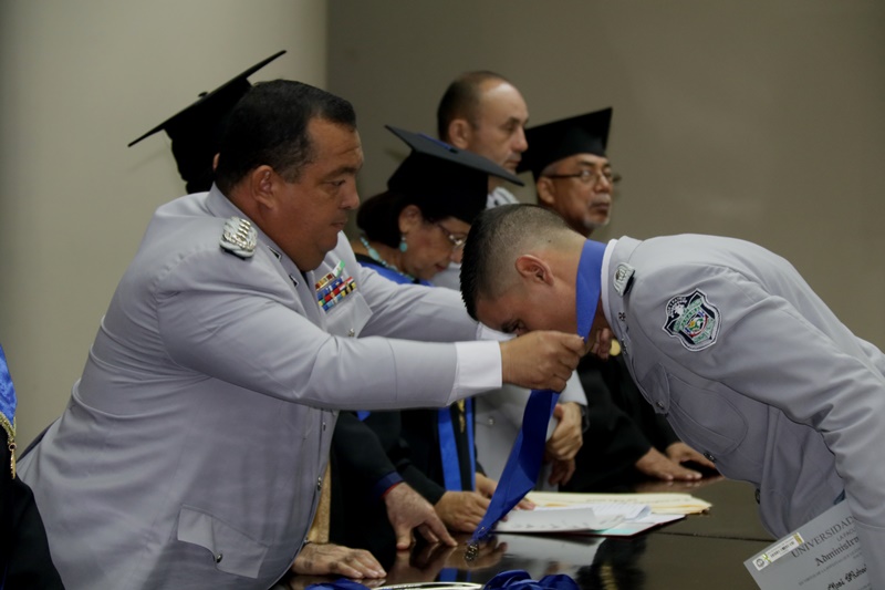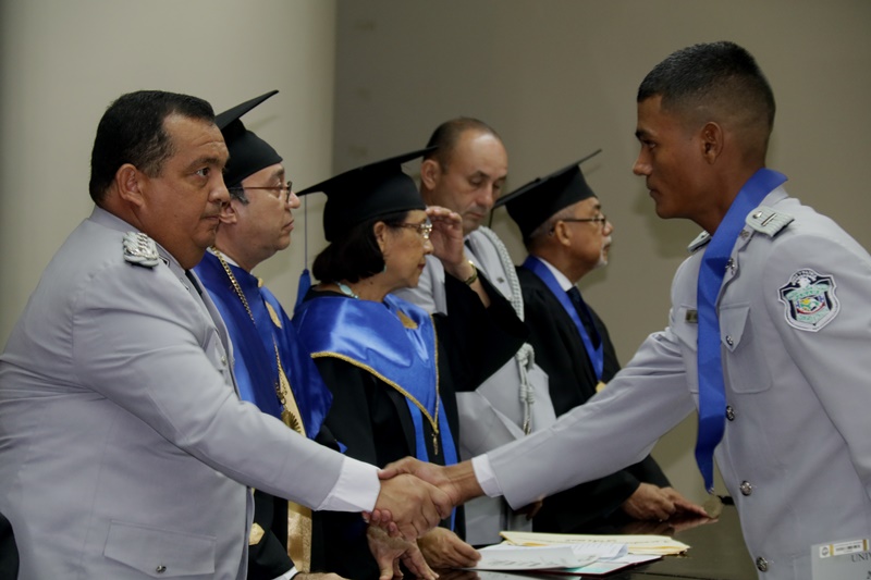 “Hoy reciben un grado muy importante producto de un esfuerzo consolidado, un cambio que inicia desde este momento, dentro de su preparación nos hemos preocupado por formar carácter, porque con sabiduría sabrán afrontar los problemas sociales para darle respuesta a la nación" fueron las palabras del Director General Omar Ariel Pinzón Marín, durante la ceremonia de graduación de Licenciatura en Admistración Policial de la promoción 17 de la Escuela de Oficiales Doctor Justo Arosemena. “La integridad, vocación, ser ejemplos y no caer en actos de corrupción son sus principales armas” apunto el Jefe Policial ante los graduandos. Con orgullo los Subtenientes recibieron el diploma que los acredita como idóneos en de Administración Policial, acto realizado en el Paraninfo de la Universidad de Panamá. El rector de la Universidad de Panamá, Eduardo Flores Castro reiteró a los oficiales el compromiso adquirido, que sirvan con responsabilidad y amor a su institución y a la Patria. Los tres primeros puestos de honor ocupados por: 1° Subteniente Kevin Earl Ardines, 2° Alexander Apolayo y 3° Gabriel Ángel Mojica, recibieron por parte de la Universidad de Panamá, un presente y pergamino de reconocimiento especial. En esta promoción bautizada con el nombre del Coronel Tomás Arguelles, se formaron también, dos oficiales del Servicio de Protección Institucional, tres del Servicio Nacional de Fronteras, y cuatro del Servicio Nacional Aeronaval. Además dos egresados de la Academia de Cadetes Mayor General José Félix Rafael Hermidas González Policía Nacional de República Dominicana. En el acto participaron el Rector de la Universidad de Panamá, Eduardo Flores; el Decano de la Facultad de Administración Pública, Magister Fidel Palacios; el Director de la Escuela de Administración Policial, Magister Abraham Magallón; el Subdirector de la Policía Nacional, Alonso Vega Pino; El Comisionado Jorge Luis Escobar, Director Nacional de Docencia de la Policía Nacional, representantes de los estamentos de seguridad, así como de miembros del Directorio Policial y familiares de los graduandos.