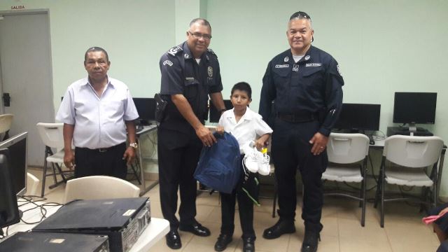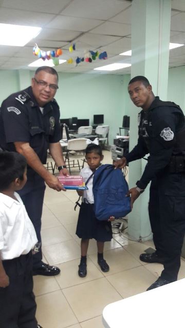 Unidades de la Policía Nacional de servicio en el Departamento de Seguridad Ciudadana de la 15va Zona Policial hicieron entrega de Mochilas escolares, zapatillas y libros a estudiantes de escasos recursos de la Escuela Santa Cruz, en Cerro Bandera, corregimiento de Pedregal. Se contó con la presencia del Comisionado Jorge Miranda jefe de la zona; Comisionado Ricky González, Jefe del Área “B” Pedregal, quienes le hicieron la entrega a los estudiantes de sus nuevos útiles escolares y los exhortaron a continuar sus estudios. Los directivos de la escuela se manifestaron estar muy agradecidos con la Policía Nacional por el apoyo incondicional que se les brinda a los estudiantes. |