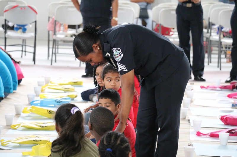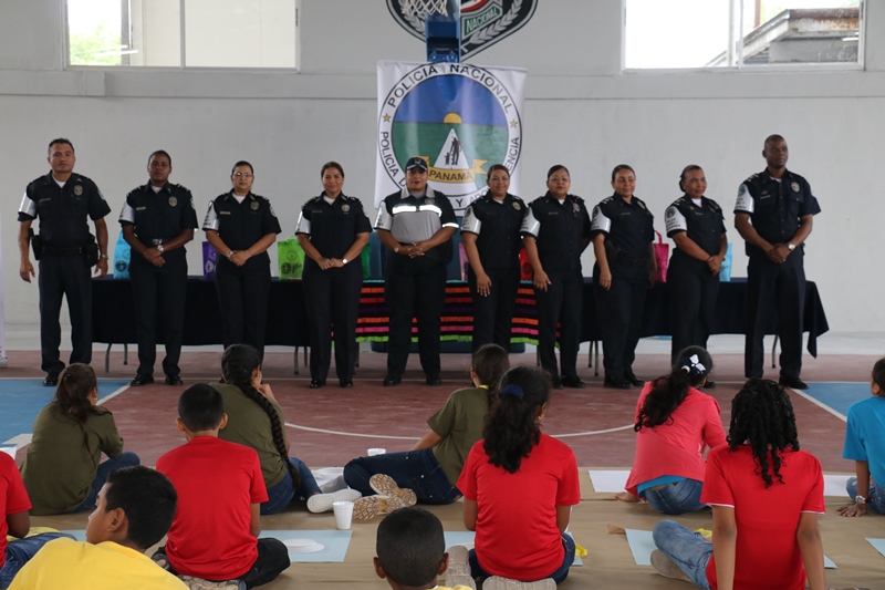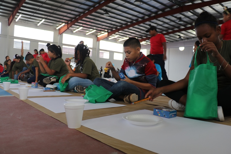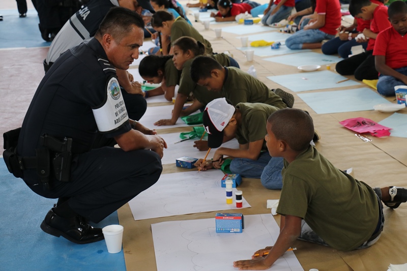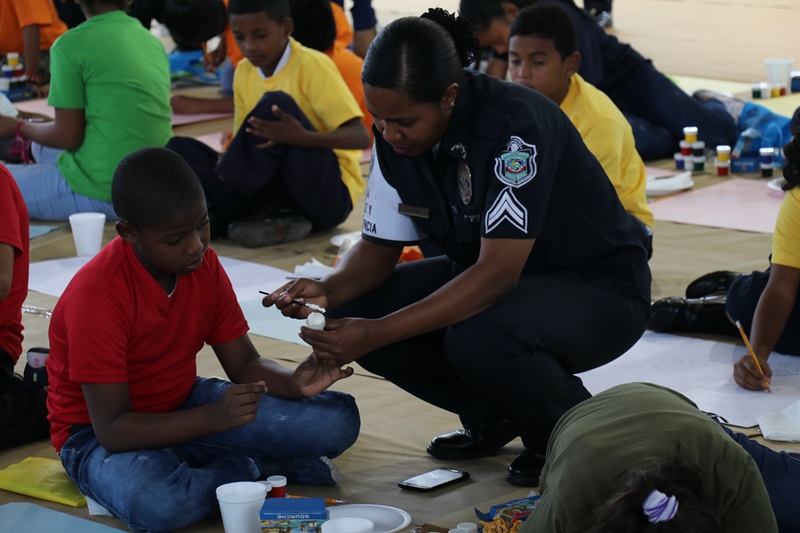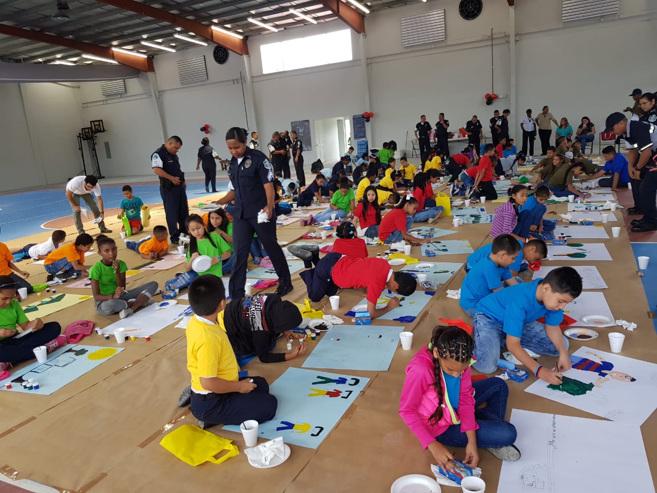 Bajo el nombre “Pinto y marco huellas en mi presente”, un grupo de 100 niños y niñas de las diferentes zonas policiales del país, participaron en un taller de pintura, en la sede principal de la Policía Nacional, ubicada en Ancón. La actividad forma parte de la clausura del primer trimestre de los programas DARE (Educación en Resistencia al uso y Abuso de Drogas) y GREAT (Educación y Entrenamiento en Resistencia a Pandillas), llevados a cabo por la institución Policial a través del Servicio de Policía de Niñez y Adolescencia, en los diferentes centros educativos. La Capitana Stephanie Anorio, del Servicio de Niñez y Adolescencia, indicó que con estos talleres se busca promover el arte en los pequeños, además desarrollar en ellos, el amor por la pintura, la cual estimula la comunicación, la creatividad y aumenta la capacidad de concentración. Un equipo de la Fundación de la reconocida pintora panameña, Olga Sinclair, estuvo presente en la actividad donde compartieron con estos pequeños que a través del dibujo y la pintura expresaron lo aprendido en estos programas de Desarrollo Humano. Como invitados asistió el Lic. Luis Quinzada Especialista de Proyectos de la Embajada de los EE.UU, Gustavo Polanco, profesor de Arte de la Fundación Olga Sinclair, representantes de la Secretaria de Nacional de Niñez, Adolescencia y Familia.