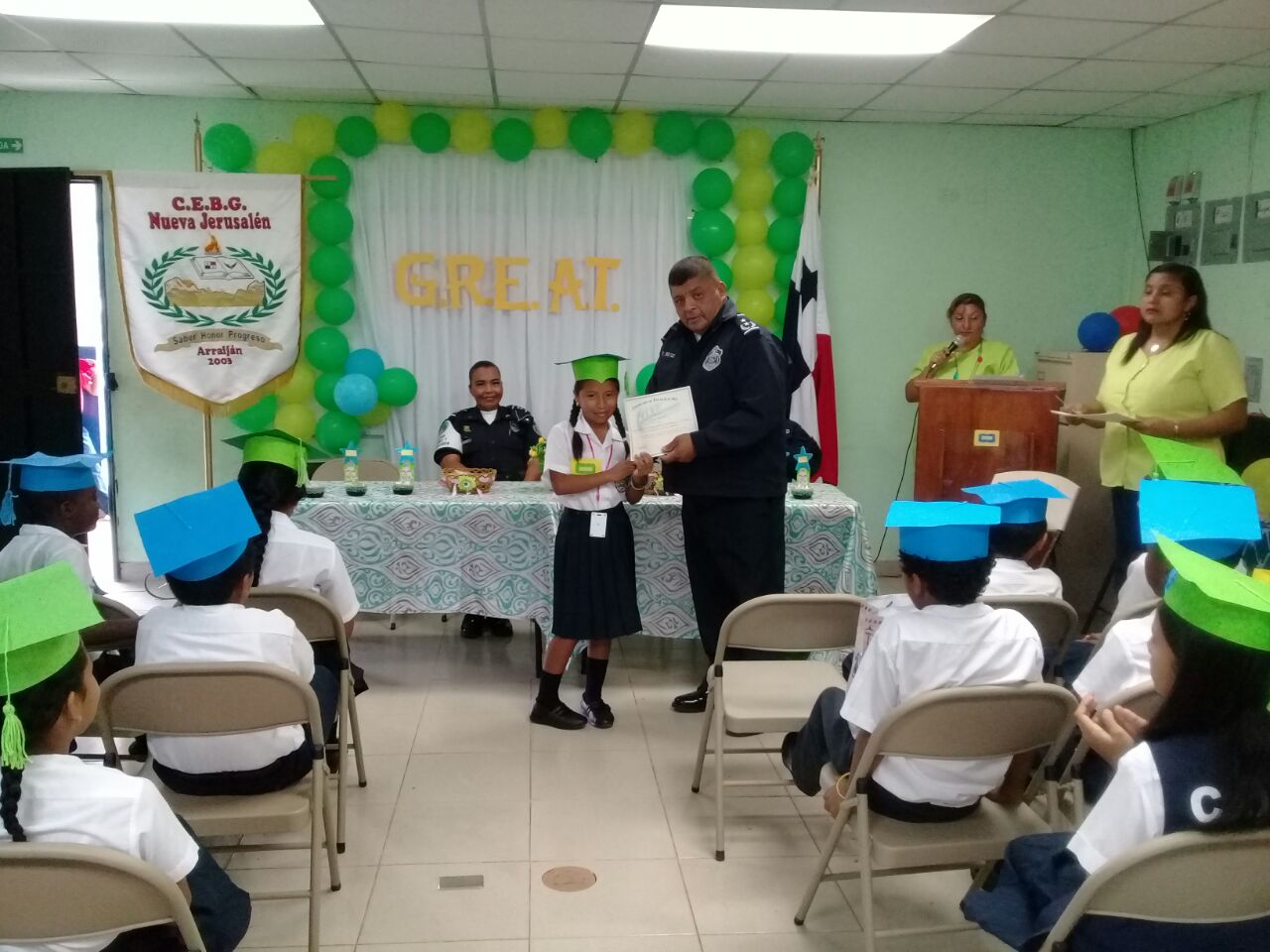 Orgullosos de servir a la comunidad y a la niñez panameña, uniformados de La Policía de la Niñez y Adolescencia en Arraiján gradúan a estudiantes en el programa de Educación y Entrenamiento en Resistencia a las Pandillas G.R.E.A.T en la escuela Nueva Jerusalén en Burunga, Arraiján. Más de 100 estudiantes fueron beneficiados en esta ocasión con los conocimientos y estrategias que estipula el mismo y pone a través de las unidades policiales las herramientas para el niño, niña y adolescente a enfrentarse a flagelos y situaciones donde tomar una decisión de resistencia salva el futuro individual de cada uno y el de un país entero. G.R.E.A.T es un programa nacional e internacional de prevención y basado en la evidencia de sus resultados, ha estado creando la confianza entre las fuerzas del orden público y las comunidades durante muchos años, por lo que la Policía Nacional de Panamá sigue beneficiando a muchos estudiantes con esta metodología preventiva. Con una ceremonia de graduación, destacando a los estudiantes sobresalientes en este programa, premiados y todos certificados se llevó a cabo esta clausura en presencia de unidades policiales de la zona , docentes y padres de familia. |