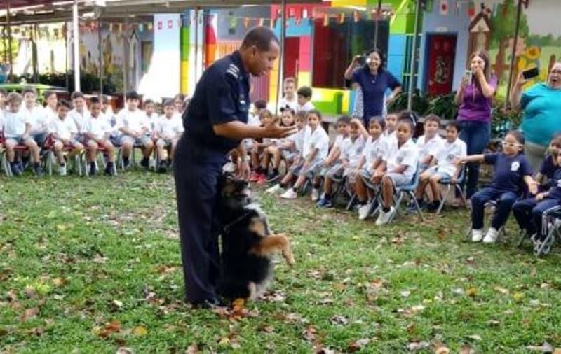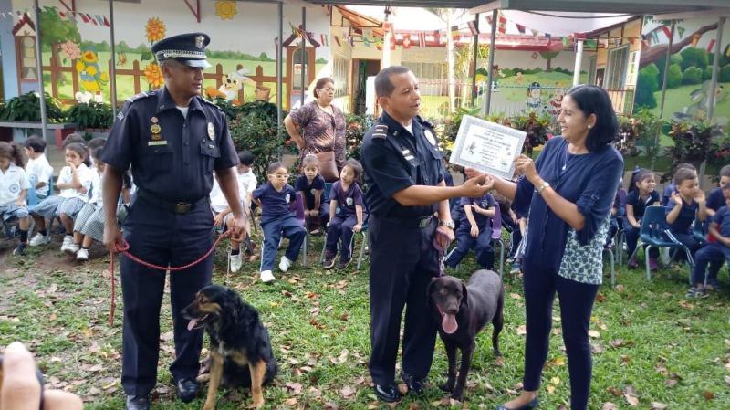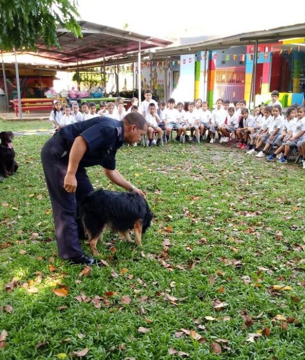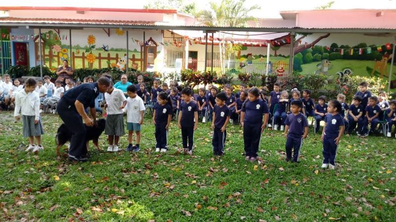 Continuando con el acercamiento en las escuelas y colegios, unidades de la Subdirección de Operaciones del Tránsito en la provincia de Chiriquí y del Servicio de Seguridad Ciudadana, impartiendo docencias prevención y seguridad a los estudiantes. La Cabo 2do. Jaens Pinzón y la M.N.J. Rosaura Villarreal capacitaron a más de 100 niños y niñas de los niveles de Maternal, Pre-Kínder y Kínder donde trataron los siguientes temas: Seguridad Vial, Deberes y Derechos de los Niños, Seguridad Personal, Como actuar ante extraños y Motivación. Por otra parte, el Teniente Hernán Beitía, la Cabo 1ro. Karina Pinto, se encargaron de pintarles las caritas a los pequeñines, con formas de animalitos, corazoncitos y florecitas, quienes se mostraban muy contentos y agradecido con dinámicas realizada. Mientras que, el Grupo Juvenil Canino “GRUJUCAN” de la 4ta. Zona Policial de Chiriquí, realizó una presentación canina en dicho colegio. El Subteniente Héctor García, encargado del grupo manifestó que llevaron mucha alegría a los pequeñines del centro educativo, ya que los canes efectuaron exhibiciones de destrezas, obediencias y habilidades. Igualmente instruyó a los niños en la importancia de aseos en las mascotas. “Continuamos trabajando en beneficio de la niñez Chiricana, a través de estos programas preventivos”, expresó el oficial.