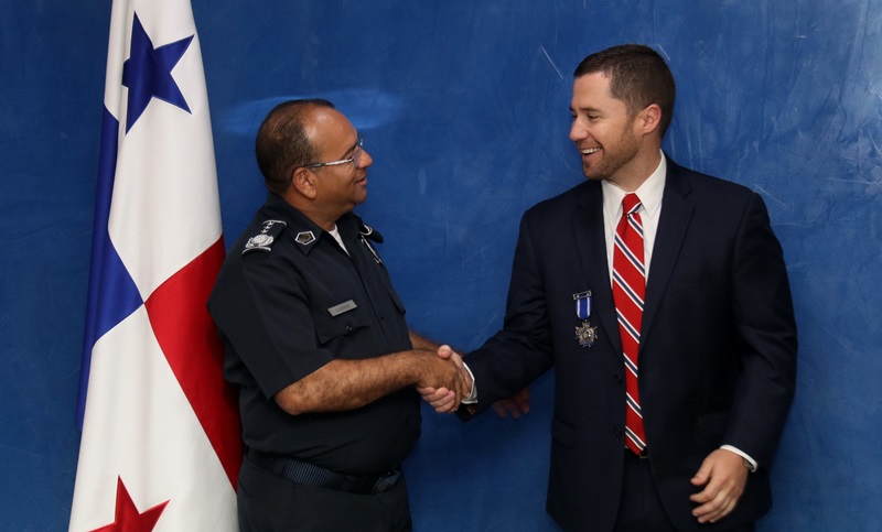 Panamá 31 de julio 2018. El Subdirector General de la Policía Nacional, Jacinto Gómez impuso la medalla "Policía Nacional" a Brian Mulcahy, enlace de la Oficina de Administración de Control de Drogas (DEA) en Panamá, con la medalla “Policía Nacional” por su extraordinario servicio, responsabilidad y consagración en el ejercicio de sus funciones de coordinación, cooperación y asistencia profesional en materia de seguridad. El Agente Mulcahy, quién culmina 4 años de misión en suelo istmeño, agradeció por la hospitalidad brindada a esta institución de seguridad y los logros en equipo obtenidos a través de operaciones contra el narcotráfico. “Es un honor y un orgullo haber tenido su presencia por muchos años en nuestro país, luchando incansablemente contra agrupaciones transnacionales dedicadas al tráfico y venta de drogas, que tanto daño hacen a las sociedades” fueron las palabras del Subdirector General Gómez en agradecimiento a este oficial. Por su parte, el Inspector General Néstor Valdez; el Secretario General Ezequiel Carrizo, el Director Nacional Antidrogas John Dornheim y el Comisionado Gilberto Glen estuvieron presentes en el acto de reconocimiento.