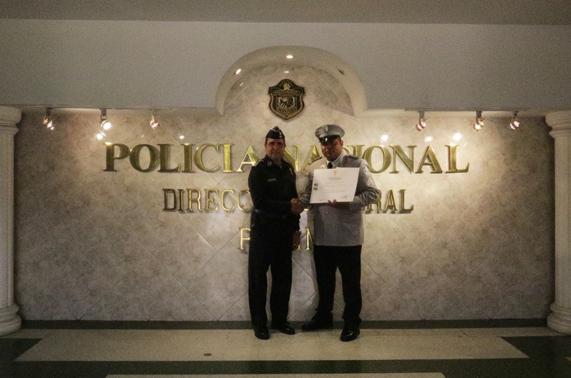 El Sargento 2do. Héctor Roger Concepción Doblas, de la Dirección Nacional de Operaciones de Tránsito de la Policía Nacional, retornó al país luego de cinco meses de capacitación en la Escuela de Suboficiales Mayor Fabriciano González Urzúa de la Policía Carabineros de Chile, donde obtuvo su especialidad en Investigador de Accidentes de Tránsito (Ayudante). Los conocimientos fueron impartidos por especialistas de la Sección de Investigación de Accidentes de Tránsito (SIAT), ubicada en esta escuela de formación del país hermano, sobre conceptos en la elaboración de dibujos, toma de medidas y otros temas que son una herramienta de utilidad para el análisis y reconstrucción de accidentes. También, el Cabo 2do. David Zurita, presentó su certificado tras culminar el curso de procedimientos y técnicas empleados en la inteligencia policial. Ambos uniformados fueron recibidos por el Secretario General de la Policía Nacional, Comisionado Ezequiel Carrizo, quien los felicitó en nombre del Director General, Alonso Vega Pino, a la vez que los motivó a continuar aportando su experiencia en la Institución y cumplir nuevas metas. |