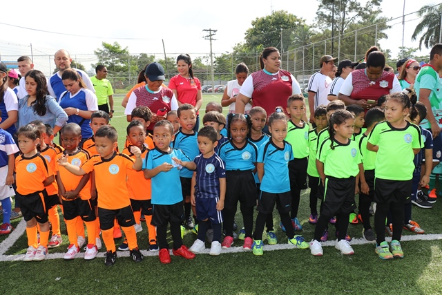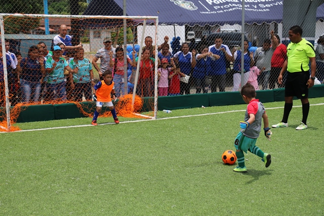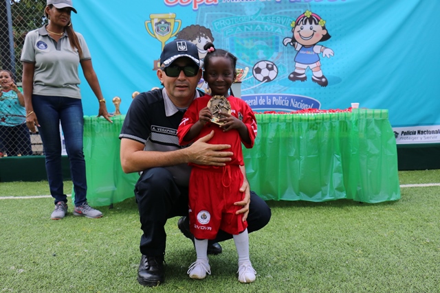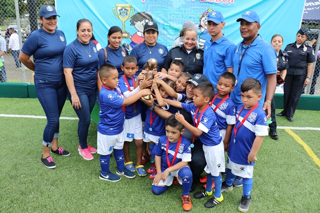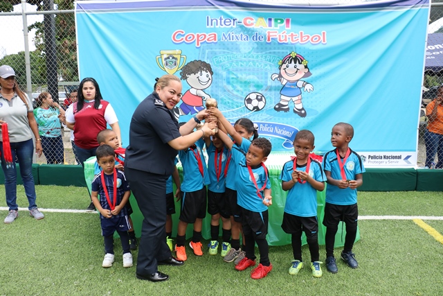 Una mañana llena de alegría, competencia y goles fue lo que se vivió en la 4ta. edición de la inter-Caipi mixto “Copa Director General“, celebrada este viernes 3 de agosto en la cancha sintética de la Policía Nacional, ubicada en el corregimiento de Ancón. En este torneo participaron estudiantes de los diferentes Centros de Atención Integral a la Primera Infancia (CAIPI) de la institución policial, donde se disputaron en 12 juegos los equipos de Panamá Oeste, Balboa, Colón, Chiriquí y Veraguas. En la categoría Pre Jardín los pequeños del Caipi “Rayito de Sol” de Balboa se alzaron con la copa en una final contra el Caipi “Fuente del Saber” de la provincia de Chiriquí, mientras que en la categoría Jardín el Caipi Mi Alegría de la provincia de Veraguas se llevo el primero lugar contra el Caipi “Rayitos de Sol” de Balboa. En esta fiesta deportiva se dio cita el Director General Alonso Vega Pino en compañía del Subdirector Jacinto Gómez, miembros del directorio policial y padres de familia. “Este evento nos sirve para aprender del trabajo en equipo que desarrollan estos pequeños los cuales buscan resaltar el talento en el futbol enfocado en valores” agrego el Director General Alonso Vega Pino. Los participantes se hicieron acreedores de premios al mejor goleador, mejor guardameta, jugadora más valiosa a su vez se llevaron trofeos, medallas y regalos por su valiosa participación en esta copa. |