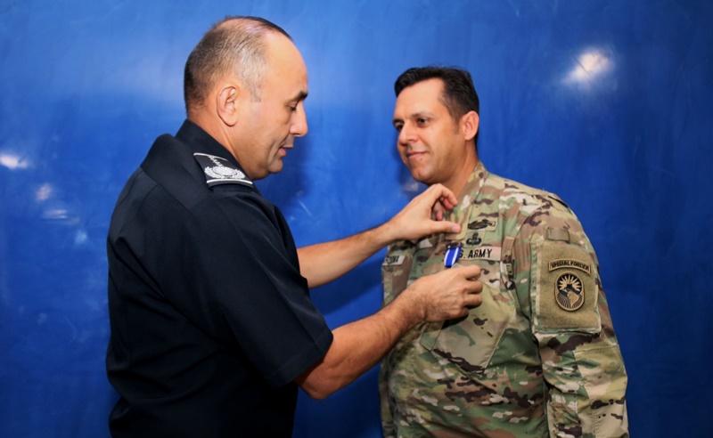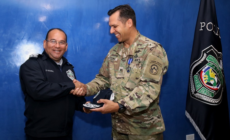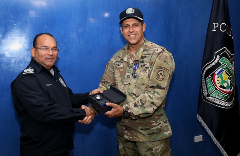 El Director General de la Policía Nacional Alonso Vega Pino y el Subdirector Jacinto Gómez, condecoraron este miércoles 8 de agosto de 2018, al coronel Javier Cardona, Director de la Oficina de Cooperación de de Defensas de la Embajada de Los Estados Unidos de América en Panamá, tras dos años de servicio. “La Policía Nacional es tu familia y nuestro país es tu país, gracias por todo el apoyo brindando y el trabajo en equipo realizado” fueron las palabras de agradecimiento del jefe policial. El Director saliente de la Oficina de Cooperación de de Defensas de la Embajada de Los Estados Unidos en Panamá, agradeció la hospitalidad brindada por la Policía Nacional, durante el trabajo en equipo y exhortó a su relevo que continúe con los lazos de amistad y los proyectos futuros. Al Coronel se le impuso la medalla de la Policía Nacional, además se le entregó obsequios, por su alto grado de profesionalismo, responsabilidad, disciplina, vocación de servicio, en el ejercicio de sus funciones. El coronel Steph Winkleman, es quien estará frente al Departamento de Defensa de los EE.UU, en Panamá. El salón azul de la Dirección General de la Policía Nacional, fue el escenario para este homenaje donde participaron miembros del Directorio Policial.