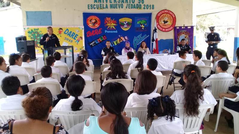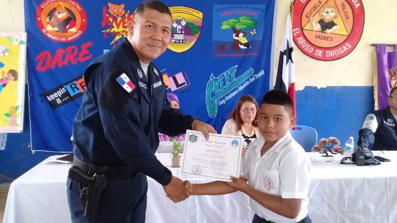 Unidades de la Policía de Niñez y Adolescencia de la 4ta. Zona Policial de Chiriquí, realizó este jueves 17 de agosto, la graduación del Programa "DARE" (Prevención de Educación para la Resistencia al Uso y Abuso de las Drogas y la Violencia), en la Escuela de Nuevo Vedado, ubicada en el distrito de David. Se contó con la presencia del Comisionado Ovidio Gil, Ejecutivo de la 4ta Zona Policial, la Directora del Plantel Educativo, Profesora Elvia Caballero, el Teniente Jorge Gallardo, encargado de la Policía de Niñez y Adolescencia en la provincia, el Sub-Teniente Porfirio Jaramillo, instructor del programa, profesores y padre de familia. El objetivo principal es crear líderes estudiantiles dentro del plantel, donde fueron beneficiados por este programa de la Policía Nacional 90 estudiantes de primaria. El Comisionado Gil, exhortó a los estudiantes a seguir capacitándose y que se alejen de los flagelos de las drogas y la violencia. Felicitó a las madres de familia por acompañar a sus hijos en este evento como estos y la unidad policial docente encargada de dictarles este programa. “La Policía Nacional está para bríndale una mano amiga y orientarlos para que sean unas personas de bien”, manifestó el ejecutivo de la 4ta. Zona. La Profesora Inés Castillo, acotó que es un placer celebrar este acto de graduación, donde la Policía Nacional nos ha facilitado a nuestros estudiantes educación preventiva, para que lleven una convivencia sana tanto en las aulas como en sus propias casas. Los insto a que siempre tomen los mejores consejos que le brindad sus docentes.