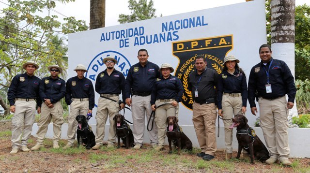 El Director de la Policía Nacional, Alonso Vega Pino hizo formalmente entrega de cuatro canes que eran parte de la Unidad Canina, a la Dirección de Prevención y Fiscalización Aduanera (DPFA) de la Zona Aeroportuaria de Tocumen, como parte de la cooperación existente entre ambas instituciones en su lucha contra el crimen organizado. El acto de entrega fue realizado en las instalaciones de la Unidad Canina del DPFA contando con la presencia del Director General de Aduanas, José Gómez Núñez, acompañados por directivos de Aduanas y de la Policía Nacional. El Licdo. Gómez agradeció el gesto de la Policía Nacional de ceder los canes que serán de gran utilidad en las funciones de control, vigilancia y fiscalización que ejercen los aduaneros todos los días, indicando además, que la Unidad Canina de Aduanas contará con todo el apoyo de parte del Despacho Superior de la institución. Cabe señalar que los caninos estarán junto a los funcionarios aduaneros que se encuentran en las labores de inspección y verificación de carga que llega al Aeropuerto Internacional de Tocumen y los que están ubicados en el área de carriles, brindando una gran ayuda a los inspectores de Aduanas, debido a su habilidad de poder detectar hasta 24 tipos de sustancias diferentes, lo que los convierte en los compañeros ideales para combatir el contrabando, el tráfico de drogas, explosivos e inclusive detectar dinero oculto por los viajeros.