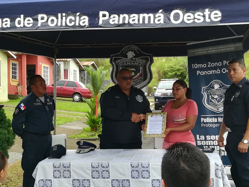 Calle Valpeña en Hacienda Montelimar, corregimiento de Barrio Colón en el distrito de La Chorrera, se integró a los programas preventivos que desarrolla el personal del Servicio de Seguridad Ciudadana, convirtiéndose en el programa número 63 de Vecinos Vigilantes. Se trata de 18 familias quienes recibieron la capacitación por parte de las unidades policiales y se comprometieron de manera voluntaria a ser vigilantes de los problemas que les atañe como comunidad y a trabajar en coordinación con las unidades de la Policía Nacional para evitar situaciones delictivas en su sector. El acto inaugural contó con la presencia del Comisionado Manuel Llorente ejecutivo de la Zona, quien hizo entrega de la Carta Compromiso a la coordinadora principal del programa señora Iris Godoy, que posteriormente procedieron al ritmo de la murga institucional a develar el letrero que los identifica como nuevos miembros de los programas de Vecinos Vigilantes.