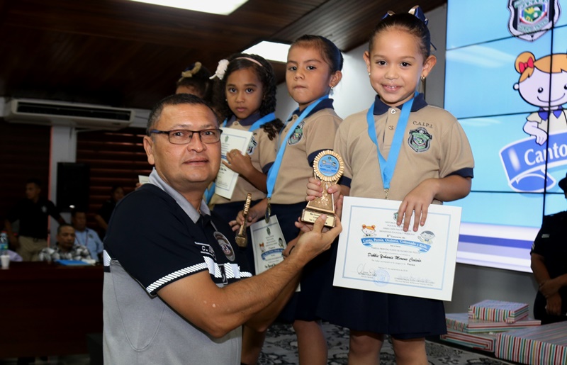 “Agradezco a los padres de familia, a los organizadores del evento y maestros de nuestros centros infantiles, porque ellos cuidan el tesoro más sagrado de nuestra institución, cuidan a los hijos de nuestros policías, por ello debemos inculcarles los valores”, destacó el Director General de la Policía Nacional, Alonso Vega Pino, en el concurso Inter CAIPI que se realizó por 6 año consecutivo en nuestra sede en Ancón. Con el lema “Familia: principal fuente de valores de la Policía Nacional”, los niños de los Centros de Atención Integral a la Primera Infancia en los niveles de Maternal, Pre Jardín y Jardín demostraron su capacidades y habilidades en las diferentes facetas de esta competencia. La niña Dana Álvarez representante de Veraguas, obtuvo el primer lugar en Oratoria; mientras que en Poesía, ganó Debbie Moreno, representante de la provincia de Chiriquí. Por su parte, la pequeña Kerlly Núñez se llevó el primer lugar en Coloreado y en Canto, el triunfo fue para Camila Hernández, ambas de la provincia de Veraguas. Este año el concurso contó con la categoría de baile folclórico, donde resaltaron la cultura de nuestras regiones, el ganador fue el grupo de la provincia de Veraguas con su baile “La Gallinta”. El Director General Alonso Vega Pino junto a miembros del Directorio Policial fueron encargados de entregar las medallas, certificados, estatuillas conmemorativas al concurso y obsequios a los participantes cuyas edades oscilan entre los cuatro a seis años. Miembros del Directorio Policial, oficiales, clases, agentes, personal no juramentado y familiares aplaudieron y mostraron su orgullo de ver el talento existente en estos niños futuros profesionales del país. La Policía Nacional a través de estas actividades busca resaltar los valores como base principal de un proceso de formación para las futuras generaciones educadas en los Centros Atención Integral para la Primera Infancia de esta institución.