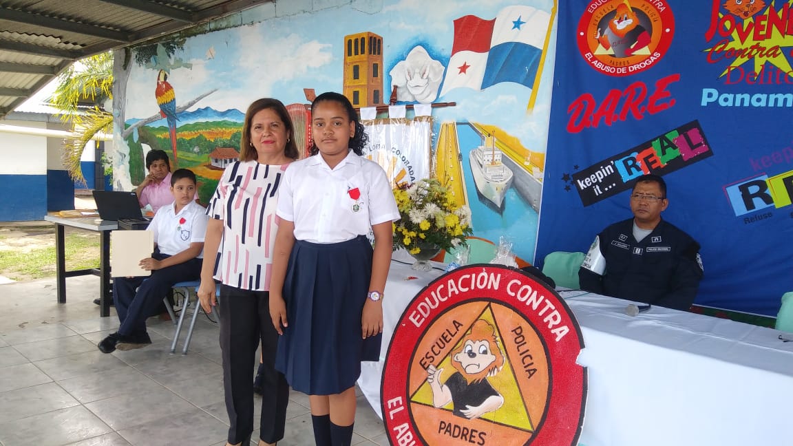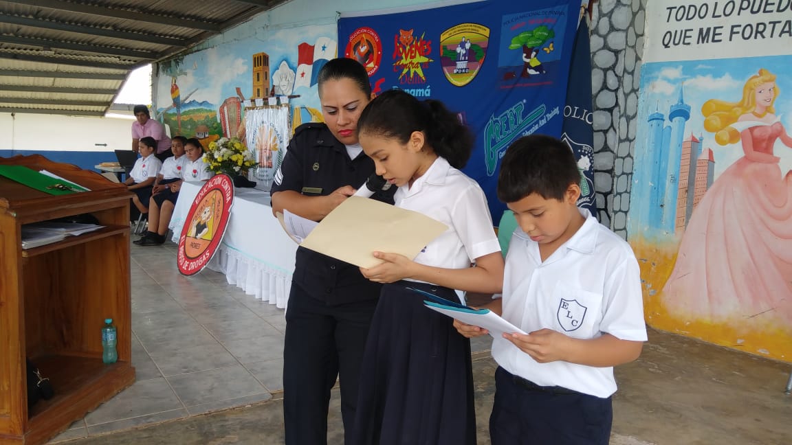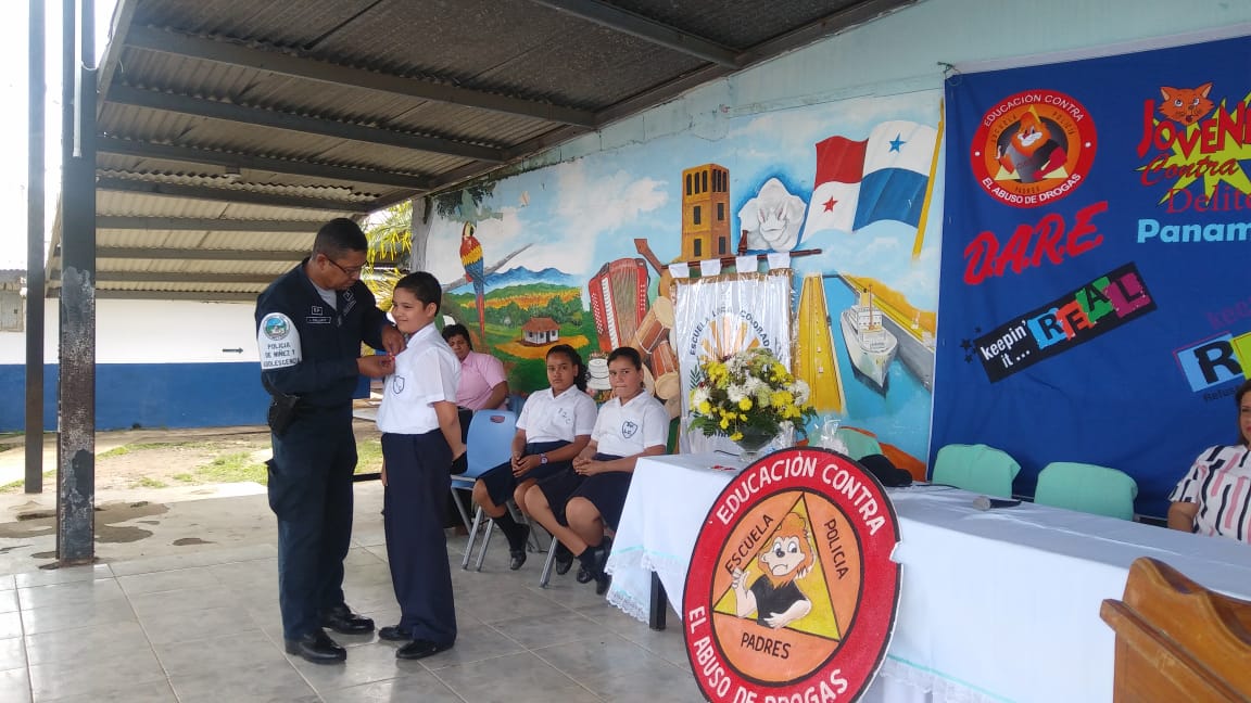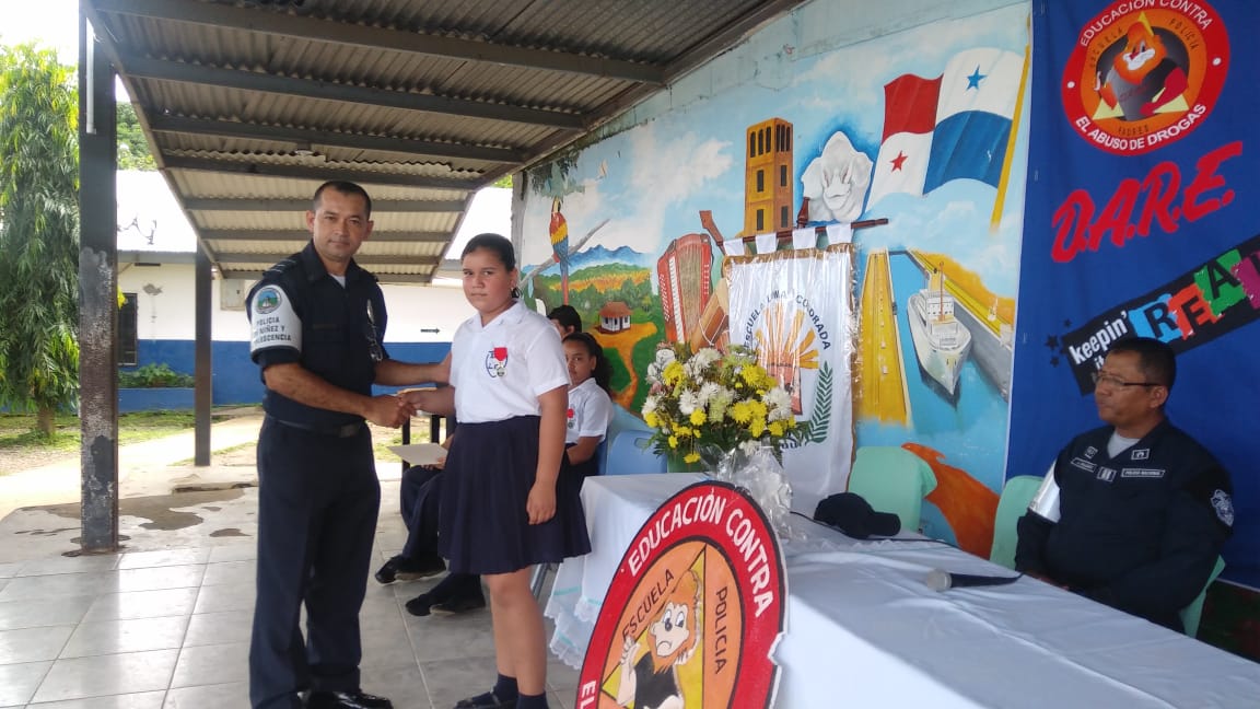 En la Escuela Loma Colorada de la ciudad de David culminó el programa que desarrolla el Servicio de Policía de Niñez y Adolescencia, conocido por sus siglas en inglés, D.A.R.E., que significa Educación para la Resistencia al Abuso de Drogas y Violencia. El programa D.A.R.E. tiene como objetivo proporcionar información a niños y jóvenes sobre los efectos nocivos de las drogas y la violencia para mantenerlos alejados de los vicios y las pandillas. Los beneficiados fueron unos 184 estudiantes de 5to. y 6to.grados. La Profesora Angélica Checa, directora de la escuela, agradeció a la Policía Nacional por este tipo de programas que ponen en práctica en diferentes centros educativos de la provincia. “Felicito al Teniente Jorge Gallardo, encargado del Servicio de Policía de Niñez y Adolescencia en Chiriquì, y al instructor del Programa D.A.R.E. Subteniente Porfirio Jaramillo, por capacitar a los estudiantes para que tengan su mente clara y una conducta positiva”, destacó la profesora Checa. Mientras que el estudiante David Artemio Pineda Ríos dio las palabras por parte de ambos grados beneficiados, y se comprometieron a tomar decisiones sanas y responsables, decirle No a las Drogas, a las pandillas, delincuencias, Bullying y al fracaso escolar. Si al estudio. Por su parte, el Mayor Ezequiel Pérez, encargado de la Unidad Preventiva Comunitaria “UPC”, quien habló en representación del jefe la 4ta. Zona Policial de Chiriquí, Comisionado Sisinio Núñez Rodríguez, felicitó a los estudiantes que recibieron sus certificados de culminación del curso y los exhortó a que no caigan en droga y violencia. Deben tomar decisiones positivas en su vida.