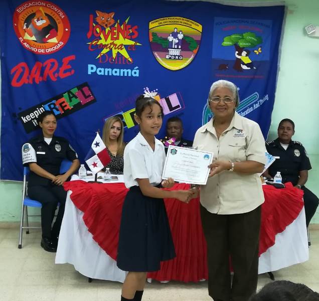 Unos 52 estudiantes del 6to. grado del Centro Educativo Básico General El Trapichito en La Chorrera, culminaron con éxito el programa preventivo de la Policía Nacional, Educación para Resistir el uso y abuso de las drogas y la Violencia (DARE), que impartieron las unidades de Niñez y Adolescencia de la 10ma. Zona. La cabo 1ro.Lourdes De Gracia instructora del curso destacó que el objetivo del programa es orientar a los estudiantes, para prevenir que sean víctimas del flagelo de las drogas y alejarlos de personas con malas costumbres que los pueden perjudicar. La entrega de certificados, reconocimientos y medallas estuvo a cargo del comisionado Luis Navarro jefe de la Zona, la Capitán Ilka Prado encargada del Servicio de Niñez y Adolescencia e La Chorrera, la directora del plantel la magister Melitza Mata, y la directora regional del SENNIAF Panamá Oeste Rosa Iturralde y la instructora cabo 1ro. Lourdes de Gracia. Por su parte la magister Melitza Mata, directora de la escuela, manifestó su agradecimiento a las unidades de la Policía Nacional, por integrar este tipo de programa en las escuelas y sobre todo pedir desde ahora, que para el próximo año su escuela pueda recibir este beneficio del cual está segura que será de gran utilidad no solamente para los estudiantes sino también para todas las la familias. |