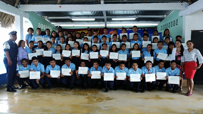 Con gran satisfacción más de 300 estudiantes de diferentes escuelas se graduaron del programa de la Policía Nacional Educación y Entrenamiento en Resistencia a las Pandillas (G.R.E.A.T.), impartido por unidades de la Policía de Niñez y Adolescencia en la provincia de Coclé. Cabe destacar que entre las escuelas beneficiadas con el programa de desarrollo humano de la Policía Nacional se encuentran los Centros Educativos Ángel Guardián en el distrito de la Pintada, Pablo Alzamora de Penonomé, Manuel Patiño en Antón, Churuquita Grande, Salitrosa y Ana Polo Tapia en Aguadulce. El teniente Ismael González encargado del servicio de Niñez y Adolescencia en Coclé, expresó que hasta la fecha unas 48 escuelas han sido beneficiadas con el programa G.R.E.A.T, donde satisfactoriamente 3,883 estudiantes han culminado el programa preventivo en este año y faltan aún por graduar 376 estudiantes en los diferentes planteles escolares de la provincia, así dio a conocer el uniformado. Es importante recalcar que en estos actos se llevaron a cabo bailes folklóricos, presentaciones e interpretaciones de mejorana y contaderas alusivas al desarrollo del programa G.R.E.A.T. de la Policía Nacional en las escuelas, además entregaron reconocimiento a los estudiantes de mejor desempeño en el curso al igual que a los instructores. Se conto con la presencia del comisionado Aníbal Prados, jefe de la Zona Policial Coclé, el capitán Jorge Sánchez encargado de área A Penonomé, teniente Ismael González encargado de Niñez y Adolescencia de la Zona de Coclé, directores de las escuelas los magister Virginia Villacrees, Olmedo Valdés, Betzy Pinzón, Migdalia de Aguilar, Leonidas Cisneros, Benilda Torres autoridades del ministerio de Educación, del Instituto para la Formación y Aprovechamiento de Recursos Humanos (IFARHU), personal administrativos de las escuelas, padres de familias entre otros invitados. Para los padres de familias y educadores de los planteles educativo dijeron sentirse complacidos con el logro y trabajo que realiza la Policía de Niñez y Adolescencia en la provincia de Coclé garantizando la seguridad y prevención en sus niños y adolescentes . |