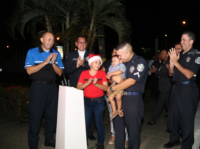 “Más que físicamente un árbol, lo importante es encender la luz del espíritu dentro de cada uno de nosotros, porque en la Policía Nacional siempre damos lo mejor de nosotros en favor de la seguridad pública”, dijo el Director General de la Policía Nacional Alonso Vega Pino, en el marco del encendido de luces del arbolito de Navidad de la Policía Nacional. Sus palabras se dieron en medio de un acto protocolar realizado en la sede de Ancón, evento este que también contó con la presencia de miembros del Directorio Policial, oficiales, agentes, personal no juramentado e invitados especiales. El encendido de luces estuvo a cargo del Señor Director General quien estuvo acompañado del niño Rayham Espinoza Cano y sus padres, el Cabo 2do. Rodolfo Espinoza y su madre Mabdiel Cano. “Más allá de esta luz que a través de estas fiestas han de iluminar nuestras instalaciones deseo hacer un llamado a todos los miembros de este cuerpo policial para pedirles que encendamos también una luz de amor, fe y esperanza dentro de nuestros corazones”, agregó Vega Pino quien resaltó que el centro de estas celebraciones es el nacimiento de nuestro señor Jesucristo en un pesebre para identificarse con los más pobres del mundo. “Esa es la auténtica luz de Navidad que debemos mantener encendida siempre”, destacó el Director General de la Policía Nacional. |