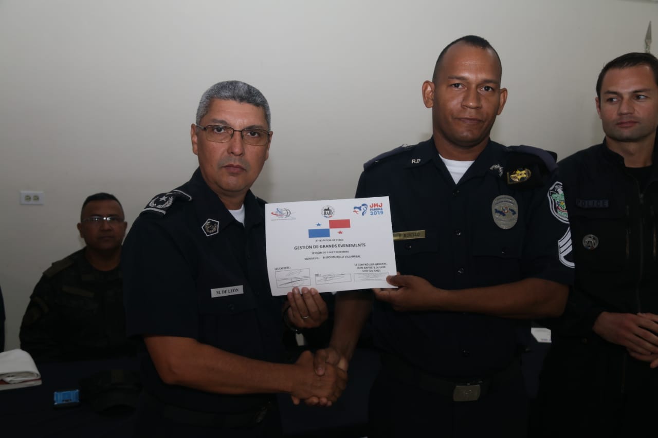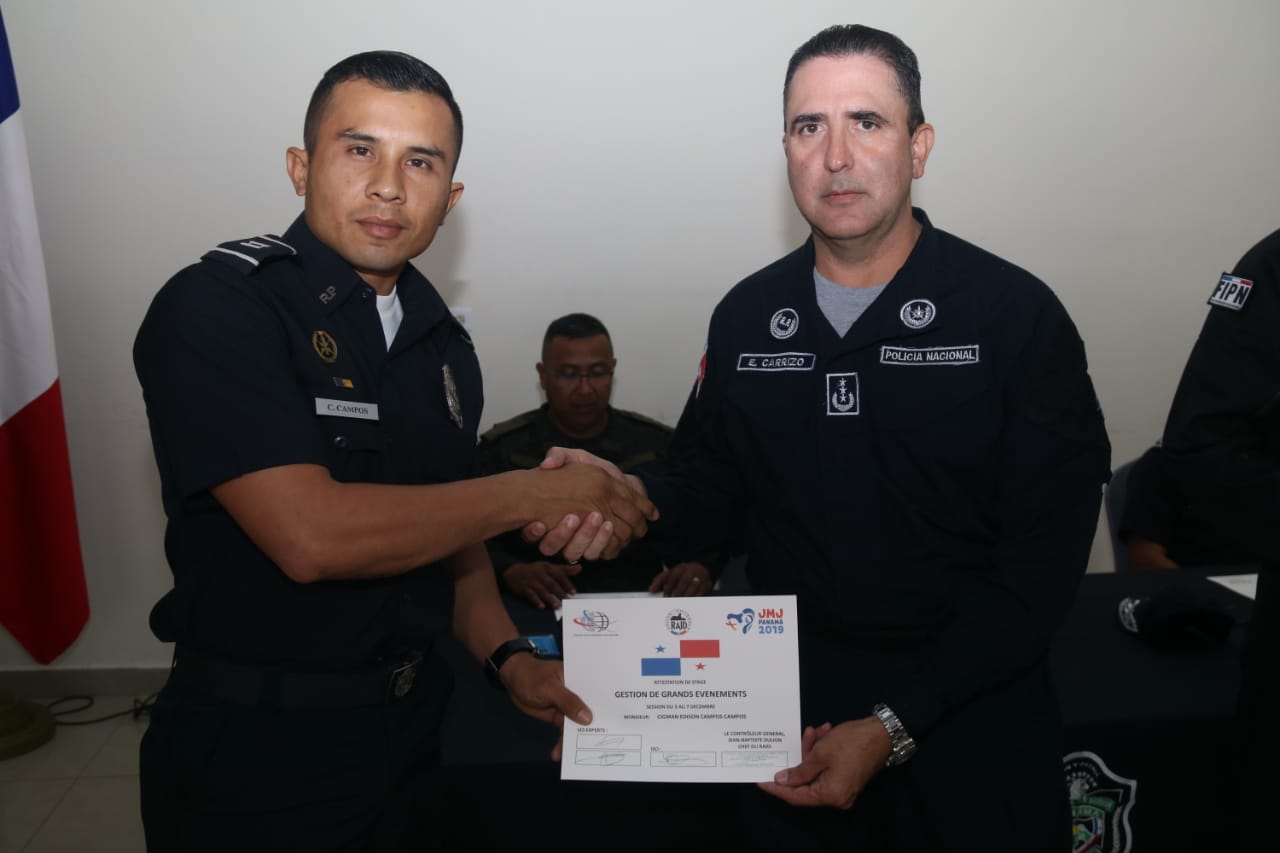 Un grupo de 19 unidades de la Policía Nacional y del Servicio de Protección Institucional culminaron con éxito el curso “Gestión de crisis durante los grandes eventos con riesgos de terrorismo” dictado por la Policía Nacional de Francia RAID del 3 al 7 de diciembre. Este curso tuvo como objetivo principal capacitar a las unidades en el área de inteligencia con prácticas enfocadas en técnicas de protección y armas con miras a lo que será la Jornada Mundial de la Juventud. “La Policía Nacional realiza este tipo de cursos con el fin de preparar a nuestras unidades para el gran el evento que se aproxima en enero 2019 y así también afrontar grandes responsabilidades como país en futuros eventos de gran magnitud” menciono el comisionado Manuel de León director General de Docencia. A este evento desarrollado en la base del S.P.I. en Corozal asistió el Secretario General de la Policía Nacional Ezequiel Carrizo, el Embajador de Francia en Panamá Brice Roquefeuil e invitados especiales. Este intercambio de conocimientos se hace posible gracias a la cooperación que mantienen ambas policías Panamá-Francia. |