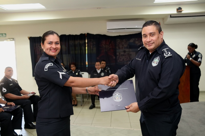 La sexta promoción de Homologación al Técnico Superior en Seguridad Pública conformada por 25 unidades policiales entre oficiales y clases, se graduaron este martes 8 de enero en el Instituto Superior Policial Presidente Belisario Porras, en Gamboa. Este acto estuvo presidido por el comisionado Manuel De León, director Nacional de Docencia; el comisionado José Castillo, director Nacional de Gestión y Proyecto; el comisionado Ramón Roca, director de Nacional de Administración y Finanzas y la comisionada Cinthia Meneses, jefa del Instituto Superior Policial. El comisionado De León, destacó la importancia de que las unidades policiales se homologuen en este técnico como parte de su especialización y brinden una atención eficaz a la población. “Es una misión permanente de la Policía Nacional que los uniformados estén en constante capacitación para cumplir con los objetivos que día a día exigen la sociedad” señaló De León. Las unidades cumplieron con la Malla Técnico Superior en Seguridad Pública donde las unidades policiales se les dictó clases de doctrina policial, técnicas de comunicación oral y escrita, Derecho Constitucional, Derechos Humanos entre otras. La formación constante de cada uno de los miembros de la primera institución de seguridad, es primordial ya que con ello se logra la eficiencia y eficacia requerida para desempeñar la labor de Proteger y Servir a la población panameña.