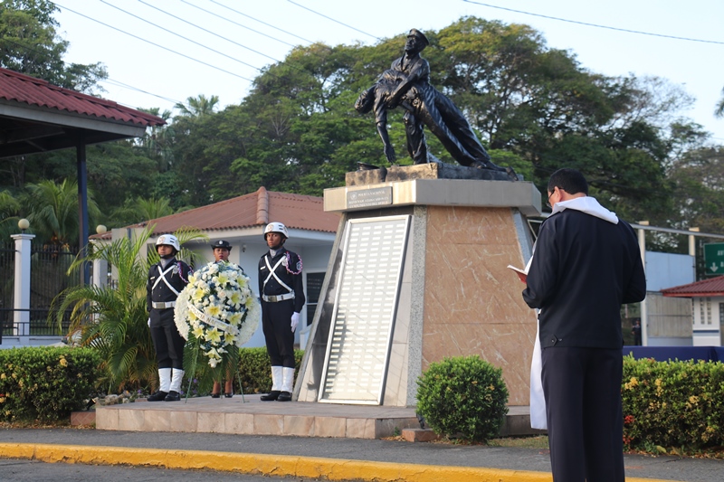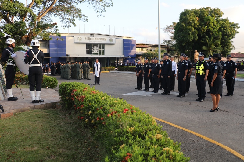 “Nosotros siempre estamos llenos de retos y compromisos, esa es la vida institucional; al Subteniente Tomás Torres, por su valentía y compromiso; a los organizadores del evento folclórico de las Mil Polleras, mis respetos por todo el trabajo, la logística, esfuerzo y la dedicación, como Director General me siento orgulloso de ustedes”, expresó el Director General de la Policía Nacional, Alonso Vega Pino durante el primer acto cívico del 2019. En medio de este acto, el Director General condecoró con la Medalla al Servicio Distinguido, al Subteniente de la Policía Nacional, Tomás Torres, de servicio en la Unidad Preventiva Comunitaria (UPC), Colón-Altos de Los Lagos, quien se enfrentó a delincuentes y se logró recuperar dos armas de fuego. “Corremos peligro cada vez que salimos a la calle, mi vida corrió peligro, pero siempre Dios nos cuida y nos protege y así pude dar con la captura del homicida y posterior recuperación de dos armas de fuego”, dijo el oficial Torres. El Subteniente Tomás Torres, narró que se encontraba patrullando por la zona cuando le correspondió capturar a un ciudadano que había cometido un homicidio, en Colón-Altos de Los Lagos. “Sentí un poco de temor porque sabía a qué me enfrentaba, pero todo fue rápido y el miedo quedó de lado”, puntualizó. El jefe policial también resaltó la importante labor que llevan a cabo las unidades en lo que será la Jornada Mundial de la Juventud y en el recibimiento que le dan a los miles de peregrinos que ya empiezan a llegar a Panamá. El Subdirector de la Policía Nacional, Jacinto Gómez, miembros del Directorio Policial, acompañaron al Director General de La Policía Nacional, Alonso Vega Pino, a la colocación de la ofrenda floral al monumento en honor a los policías caídos en cumplimiento del deber, quienes entregaron su vida por la seguridad del país. Con las gloriosas notas de nuestro Himno Nacional se dio por culminado el acto cívico.