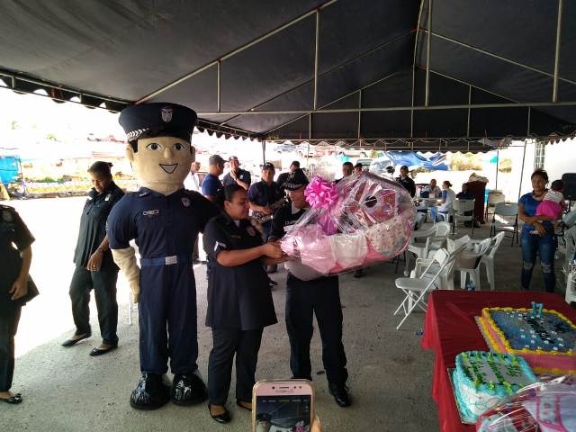 Al ritmo de las mañanitas interpretadas por el grupo de mariachis Rey Azteca, las unidades de la 13va Zona de Policial iniciaron la celebración de sus XVII de aniversario al servicio en el cumplimento del deber policial en el distrito de Arraijàn. Unidades policiales y atletas se dieron cita en la maratón que inició en La Plaza Burunga hasta la sede de la Zona de Policía de Arraiján, siendo recibidos posteriormente por la banda de música de la escuela Fernando Lessep, quienes deleitaron a los presentes con sus melodías muy auténticas y las notas del Himno Nacional de Panamá. Dando gracias Dios por permanecer en esta loable labor de ser policía, los uniformados participaron en una eucaristía precedida por el padre Edgar Flores, capellán de la Policía Nacional, quien en su mensaje felicitó a todo el equipo de trabajo de la 13va zona. El Subdirector General de la Policía Nacional Jacinto Gómez, el Director Nacional de Operaciones Gustavo Cogley, así como también señores oficiales de plana mayor del Directorio de la Policía Nacional, cantaron el cumpleaños y entregaron canastillas con implementos de bebés a unidades policiales femeninas de la zona que se encuentran en estado de gravidez. “Somos una gran familia, y eso debemos tenerlo siempre presente, les exhorto a seguir trabajando por la comunidad con el mismo ímpetu y vocación por el bienestar de todo Panamá” destacó el comisionado Porfirio Justavino jefe de la Zona de Policía de Arraiján. Entre la alegría de la contagiosa murga de la Policía y el sonido particular de los fuegos artificiales por este 17 aniversario, la comunidad de Arraiján acudió a la Feria Policial Comunitaria realizada en los estacionamientos de esta base policial. Para Culminar un equipo, se trasladó hasta el Hospital Nicolás Solano en el Distrito de La Chorrera, para entregar dos canastillas a los bebés recién nacidos en este día tan especial.