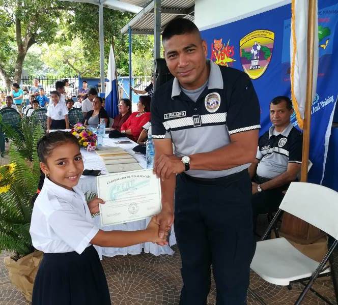El capitán Juan Palacios, en representación del jefe de la Zona Policial de Chiriquí, subcomisionado Luis Miranda, presidió la ceremonia de graduación del curso GREAT, (Educación y Entrenamiento en Resistencia a las Pandillas) en la Escuela Llano Grande Abajo de Las Lomas, en el distrito de David. 153 niños y niñas de 4to. a 6to. grado recibieron instrucción, por parte de la Teniente María González, con temas sobre cómo evitar personas vinculados en pandillas, drogas, alcohol y evitar el Bullyng, entre otras cosas. La supervisora de educación de la zona No 3, profesora Irma Ríos, y la directora del plantel, Seith de Beitia, expresaron su agradecimiento a la Policía Nacional por incluir a ese centro educativo, en sus planes de acercamiento y de seguridad preventiva, dirigidos principalmente a la juventud. “Quiero felicitarlos y espero hayan absorbido todas las enseñanzas de la instructora del curso. Sean entes multiplicadores en sus hogares y en sus comunidades”, dijo el capitán Palacios al clausurar el evento. |