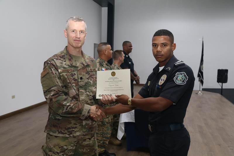 El auditorio del Instituto Superior Policial sirvió de escenario para la clausura del seminario sobre Derechos Humanos dictado por funcionarios de la Embajada de Los Estados Unidos en Panamá a miembros e integrantes de la Fuerza Pública y del Ministerio de Seguridad Pública de Panamá. El inspector general, comisionado Oswaldo Morales sostuvo que este seminario beneficia grandemente a todas las unidades que asistieron al mismo, quienes todos los días en su misión de proteger y servir entran en contacto directo con las comunidades. Añadió que dentro de los derechos humanos, entra en vigencia el buen trato al cual tienen derecho las personas en medio de la aplicación de la ley la seguridad. El teniente coronel de la Fuerza Aérea de Los Estados Unidos Steve Loertscher sostuvo que compartió con diversos países, las experiencias que en materia de Derechos Humanos han obtenido en diversas situaciones. “Siempre cuando estamos hablando de Derechos Humanos, todo ser humano debe recibir un trato con respeto y dignidad y es por eso que tenemos este tipo de evento, para recordarnos a todos, la importancia de este tema”, expresó el Teniente Coronel. En esta clausura participaron un total de 29 unidades del Servicio Nacional Aeronaval, otras 8 del Servicio Nacional de Fronteras y 14 de la Policía Nacional de Panamá además de cuatro funcionarios del Ministerio de Seguridad Pública. Correspondió al comisionado Luis Domínguez del Servicio Nacional Aeronaval agradecer a nombre de los participantes las enseñanzas recibidas. |