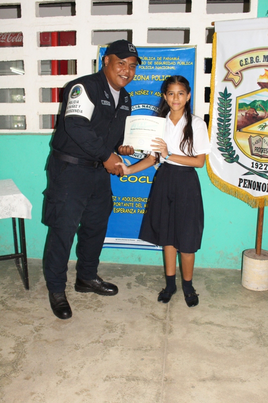 Estudiantes del centro educativo Membrillo, ubicado en el distrito de Penonomé, provincia de Coclé, recibieron sus certificados al culminar la capacitación del programa de Educación y Entrenamiento en Resistencia a las Pandillas (GREAT). Los alumnos aprendieron a decirles no a las pandillas, en las lecciones impartidas por las unidades del Servicio de Policía de Niñez y Adolescencia, quienes abordaron la presión de grupo, las consecuencias del bullying y acoso escolar, entre otros temas. La capitán Felipa Murillo dijo que con el programa preventivo se busca garantizar el bienestar de niños y adolescentes, reforzando los valores como parte de la formación integral. Por su parte, la estudiante Emily Soto del VI grado, en representación de sus compañeros agradeció al cabo Carlos González y demás miembros de la Policía Nacional por la información brindada. El director del plantel, Iván López destacó la importancia de los conocimientos que serán de gran utilidad para el personal docente. |