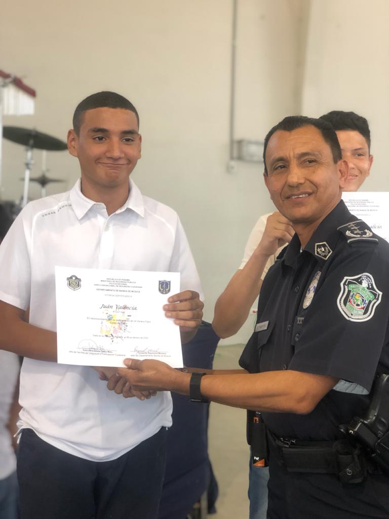 Un grupo de 85 niños, niñas y adolescentes, hijos de miembros de la Policía Nacional, demostraron su talento al culminar el programa de Verano Feliz Musical, que lleva a cabo la institución a través de la Banda de Música. Un concierto acompañado de un show artístico en el gimnasio Atheyna Baylon, ubicado en Ancón, fue preparado para que padres de familias disfrutaran de lo aprendido por sus hijos durante el mes que duró el curso. El punto más esperado fue la participación del grupo de niños con capacidades especiales, quienes demostraron sus dotes musicales llevándose el aplauso de los presentes. Canciones como: Calma de Pedro Capó y Farruko, Lo que dice que soy, Madre Tierra, fueron algunas de las interpretaciones de estos pequeños artistas. La comisionada Dalys Melo, jefa del Servicio Policial de Integración y Participación Ciudadana junto a miembros del directorio policial hicieron entrega de los certificados de participación. Los estudiantes recibieron clases de saxofón, violín, piano, trompeta y trombones, desarrollando en ellos el arte de la música. Dentro del curso los instructores, reforzaron los valores, la importancia de la disciplina, entre otros temas, que contribuyen a fortalecer su formación integral.