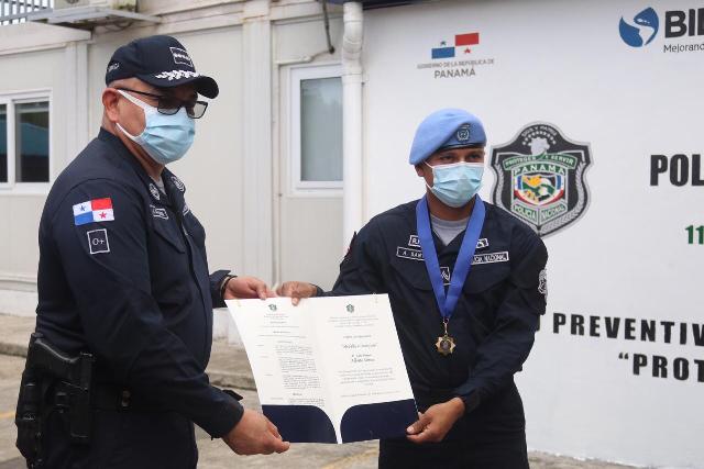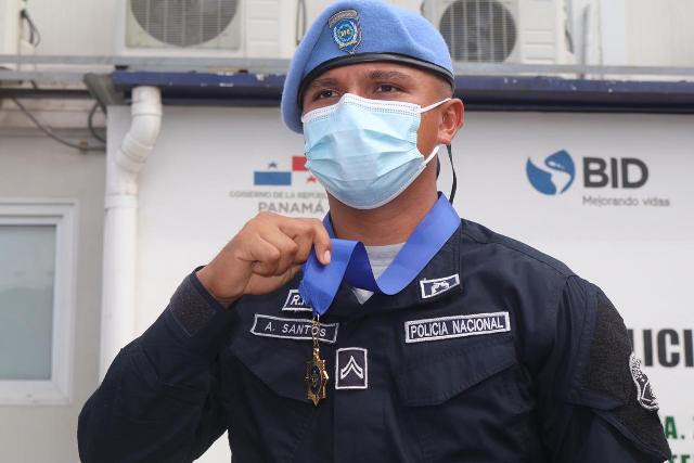 El dominio de primeros auxilios fue esencial en el Cabo Primero Alberto Santos, quien le salvó la vida a un infante, cuando no dudó en darle respiración boca a boca. “Conocer de primeros auxilios es esencial para el policía, porque estamos en constante acción y tenemos que velar por la integridad de las personas. Salvar la vida a este niño ha sido una de las experiencias más lindas en mi carrera”, señaló Santos. Por su hazaña el Director General de la Policía Nacional Jorge Miranda Molina, lo condecoró con la medalla al Sacrificio, acto desarrollado en el sector de Samaria, distrito de San Miguelito. |