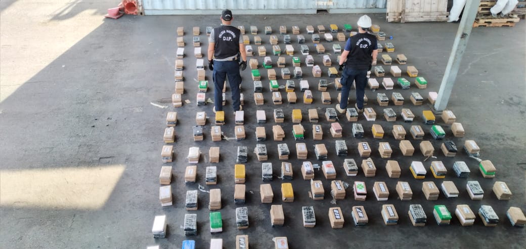 Unidades de la Dirección Nacional de Inteligencia Policial, incautaron de 596 paquetes con presunta cocaína, los cuales estaban dentro cajas utilizadas para el transporte de bananos, ocultas en un contenedor ubicado en un puerto del pacífico. Los estupefacientes estaban distribuidos entre 25 cajas de la carga procedente de Ecuador, con tránsito por Panamá e Italia y destino final, Croacia, cuando fue detectada por las unidades mediante acciones de perfilamiento, en coordinación con Aduanas Panamá y la Fiscalía de Drogas. Este es el segundo decomiso que realiza en lo que va del año la Dirección de Inteligencia Policial, dentro de una terminal portuaria, cuya cuantía aproximada en los mercados europeos está estimada en más de 80 millones de dólares, dando así otro fuerte golpe a las redes criminales. |