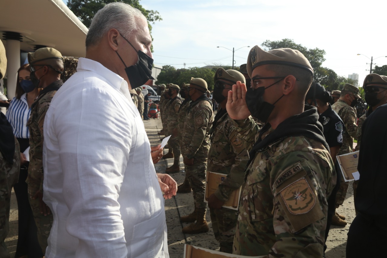 El Paseo de los Caídos, en memoria a los héroes de la Policía Nacional, fue el escenario, donde unas 150 unidades de los estamentos de Seguridad recibieron un reconocimiento a su destacada labor. “Es un reconocimiento al trabajo realizado con compromiso. La Patria nos pide a nosotros que cumplamos con nuestra misión, y seguimos adelante haciendo la diferencia, haciendo el trabajo como corresponde”, dijo el Ministro de Seguridad, Juan Manuel Pino Forero. En la ceremonia, el ministro Pino acompañado por el Director General de la Policía Nacional, John Dornheim; el Director del Senan, Jeremías Urieta y el Director de Senafront, Oriel Ortega, entregaron los certificados de reconocimiento a las unidades, quienes forman parte de diferentes servicios policiales especializados y direcciones. Este grupo de uniformados han aportado la milla extra en diferentes acciones y operativos lográndose obtener resultados positivos contra el Crimen Organizado y otros delitos. |