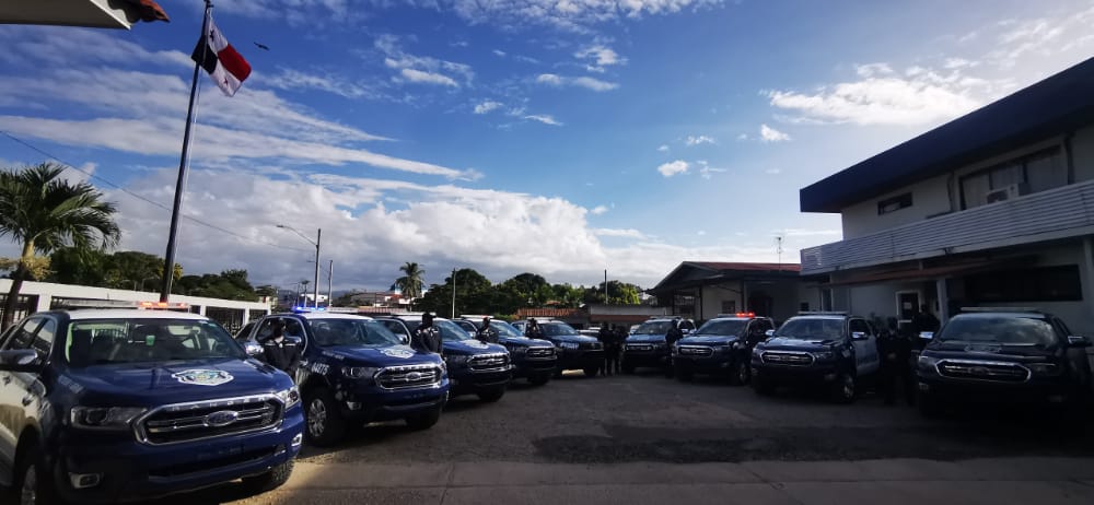El ministro de Seguridad Pública, Juan Manuel Pino junto al Director General de la Policía Nacional, John Dornheim, entregaron 15 vehículos, tipo pick up doble cabina, a la 11va. Zona Policial de San Miguelito, para reforzar la vigilancia policial en el distrito.