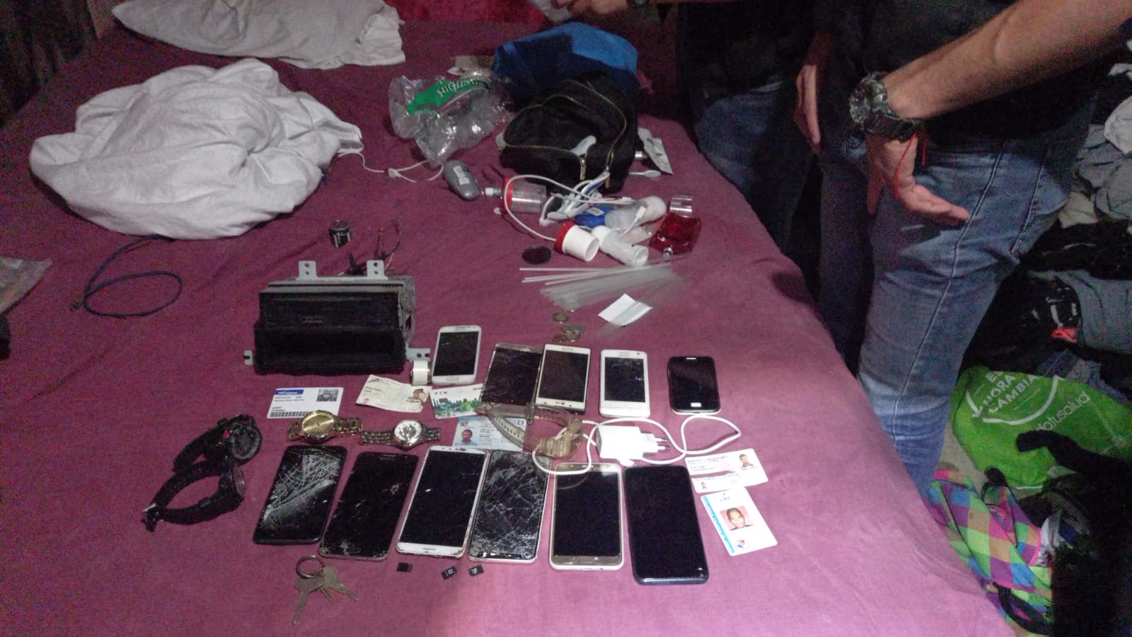 Esta madrugada la Policía Nacional, la Dij de Panamá Oeste en conjunto con el Ministerio Público realizan múltiples allanamientos en diversos sectores de Alcalde Díaz, donde ya se aprehendió a uno de los sospechosos del asalto registrado la noche de este martes 8 de febrero, en el bus expreso Panamá - La Chorrera. Estas fotografías e imágenes corresponden a los resultados que muestran documentos y celulares de las víctimas. Ocurrido los hechos rápidamente las autoridades procedieron a realizar las investigaciones y desarrollar las acciones junto al Ministerio Público, indicios necesarios para atrapar a un presunto involucrado, una persona de 25 años de edad. La Policía Nacional mantiene su acciones para atrapar y prevenir el delito. |