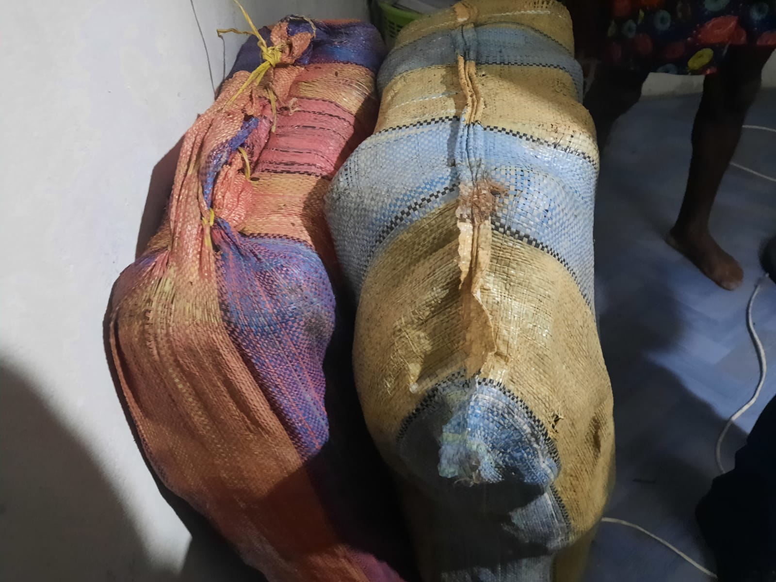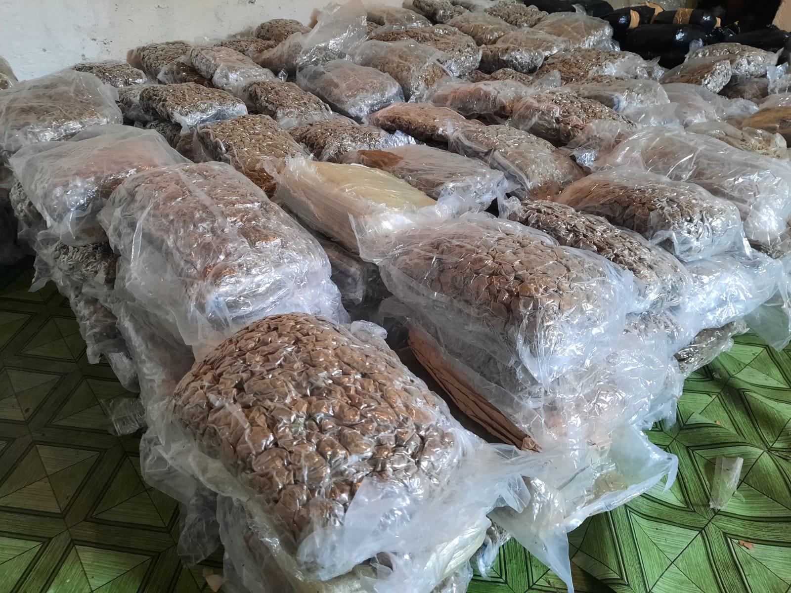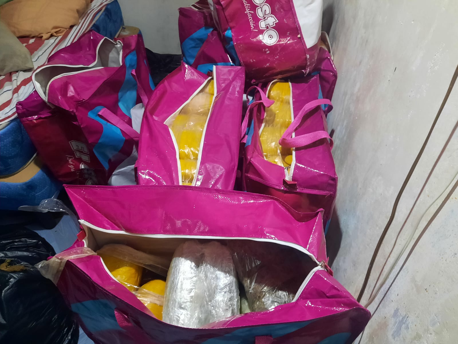 Las unidades policiales ubicaron estos paquetes rectangulares con supuesta sustancias ilícitas se presume sea Marihuana dentro de 10 sacos en el interior de una residencia.