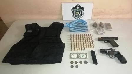 La Policía Nacional en asocio con el Ministerio Público, aprehendió a dos personas durante allanamientos, en el sector de Felipillo, corregimiento de la 24 de Diciembre, la mañana de este martes 16 de mayo. Las diligencias en busca de personas requeridas y armas de fuego, inivio a tempranas horas, arrojando como resultado además de estas aprehensiones, el decomiso de dos armas de fuego, municiones, una pesa digital y sustancias ilícitas. También dinero en efectivo y un chaleco balístico, este último hallado en el patio de una de las residencias allanadas. Los aprehendidos y la evidencia fueron remitida a las instancias correspondientes a fin de continuar con las investigaciones. |