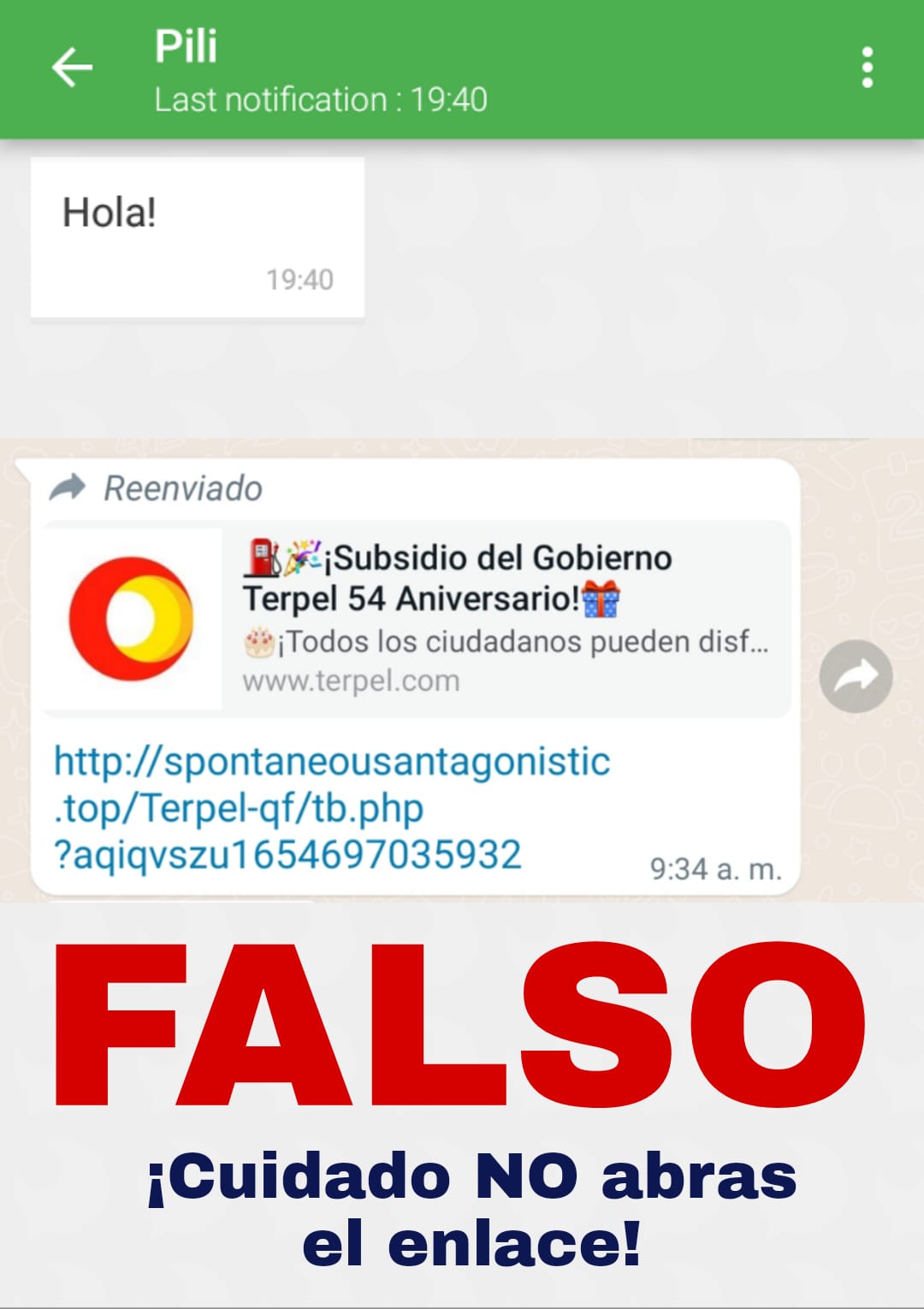¡NO DE CLIC! La Policía Nacional a través de la División de Ciberdelito alerta sobre la circulación de información falsa vía WhatsApp donde hacen referencia de un bono de combustible, el cual para acceder deben dar clic en un enlace. El capitán Wladimir González, jefe de la División Ciberdelito de la Dirección de Investigación Judicial, informó que esto es falso y así también corroborado por la empresa la cual ha sido suplantada con esta falsa cadena. El mensaje que indica ser un "subsidio del Gobierno por el aniversario de la empresa", se acompaña de un enlace, que según el experto en Ciberdelito esto redirige a quienes hagan clic a un portal donde buscan obtener más información de las personas incautas o de instalar un malware en los dispositivos donde sea abierto el enlace. "No compartamos esta información, no demos clic y reportemos los mensajes como maliciosos en la plataforma", recomienda el capitán González. No caiga en este engaño. |