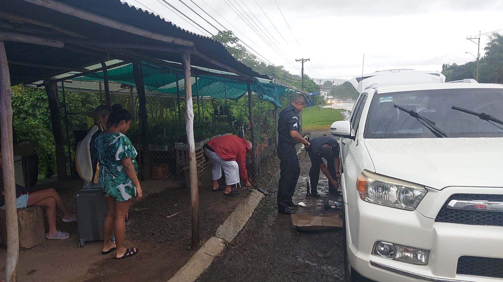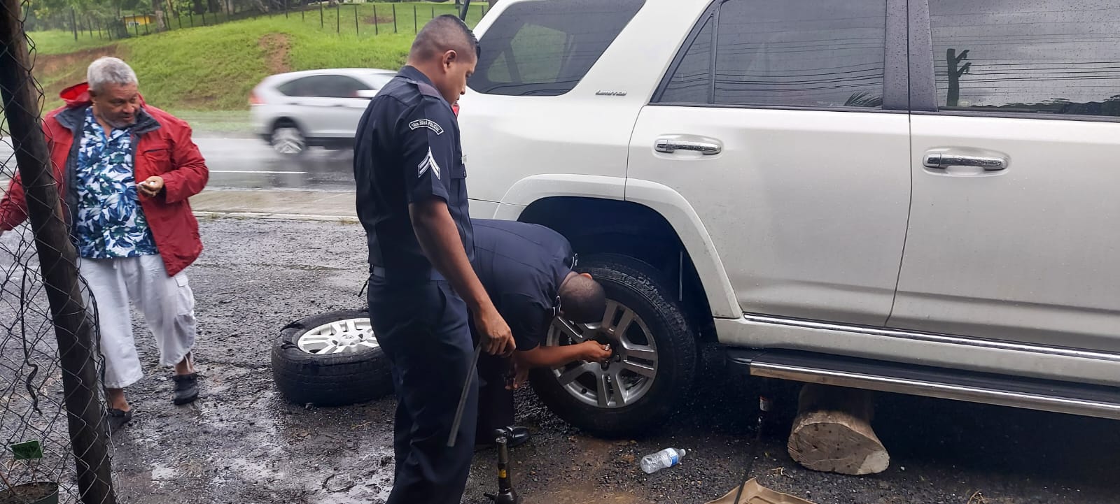 La buena acción se da cuando las unidades realizaban una ronda preventiva en la comunidad de Villa Mireya, distrito de Capira, bajo una pertinaz llovizna observaron a una familia en una parada pidiendo apoyo, ya que el vehículo en el que se trasportaban presentaba desperfecto en una de las llantas traseras, que se le había desinflado.