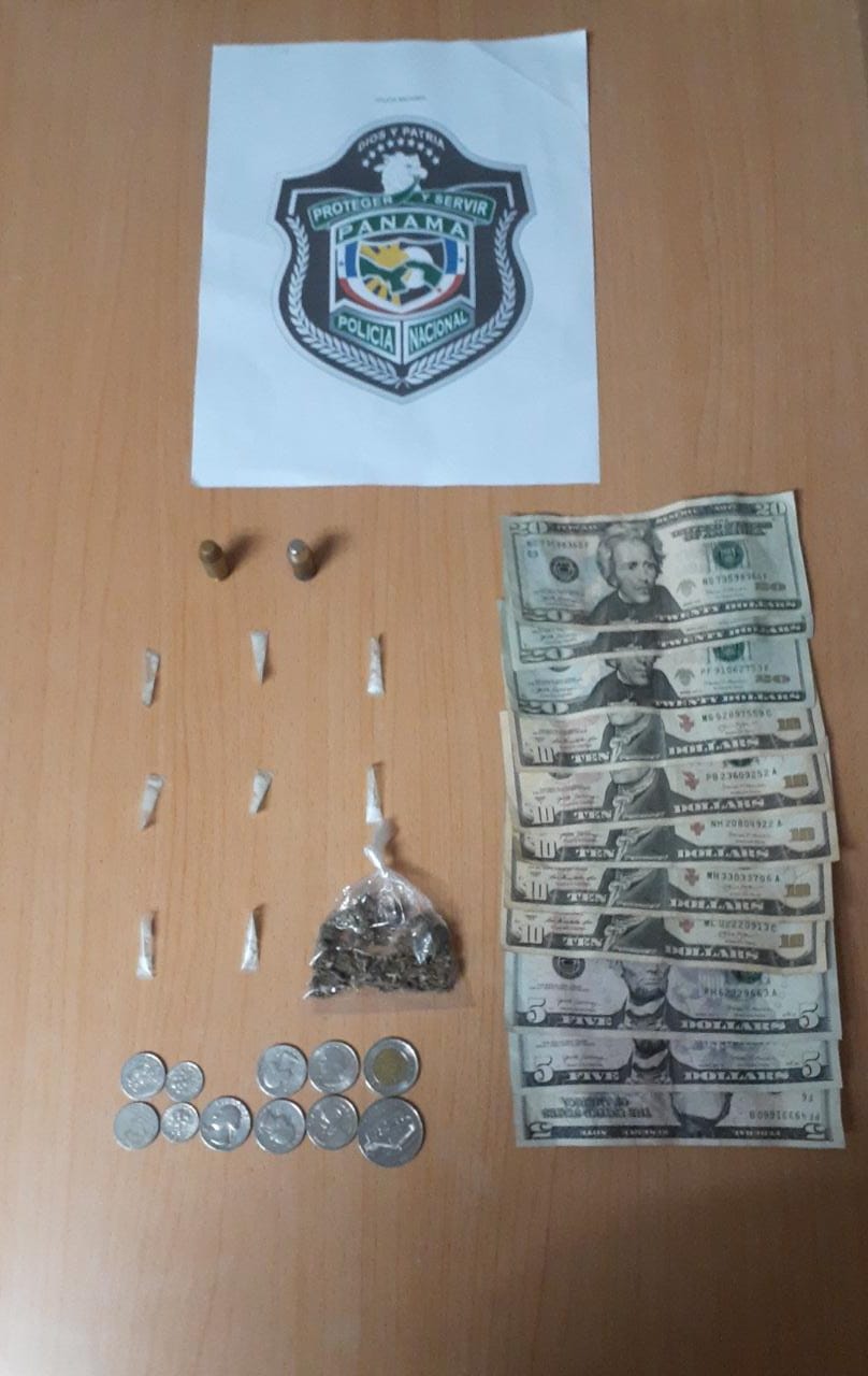 El capitán Isidro Flores, de la Zona Policial de Alcalde Díaz, indicó a que a estas personas se les encontró varios carrizo plástico transparente con polvo blanco que presume sea cocaína, una bolsita plástica transparente con hierba seca (Marihuana), municiones calibre 45, sin detona y B/. 128.05 en efectivo.