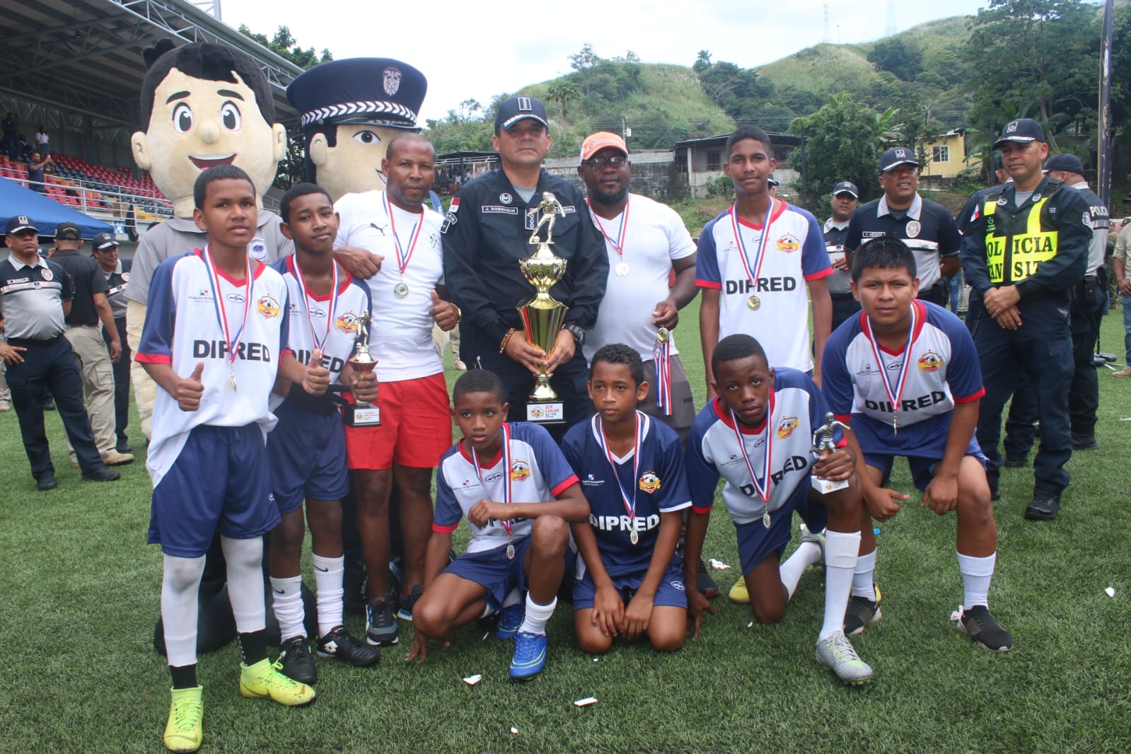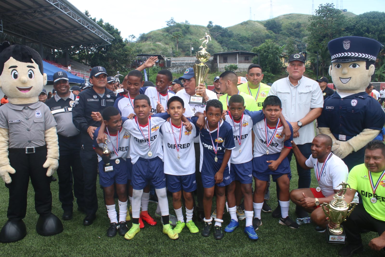 Seis equipos de fútbol llegaron a la gran final de Copa Las Estrellas, Reforzando Valores, San Francisco se ganó el primer lugar de las tres categorías 10, 12 y 14. Por su parte, los equipos de Alcalde Díaz y Caimitillo y Ernesto Córdoba Campos también fueron los Campeones en sus respectivas categorías, en este cónclave deportivo realizado en el Complejo Deportivo de Los Andes 2, en el distrito de San Miguelito. Más 330 niños, niñas y adolescentes, formaron parte de cada delegación de futbolistas, procedentes de San Francisco, Río Abajo, Parque Lefevre, Don Bosco, Caimitillo, Chilibre, Ernesto Córdoba, Las Cumbres y Alcalde Díaz. Copa de las Estrellas, de Panamá Norte y Centro tuvo una duración más de tres meses, donde le impartieron clínicas deportivas, entrenamiento psicopedágogicos, presión de grupos, prevención del tabaquismo, resistencia del uso de drogas entre otros. Y a los entrenadores y padres de familia les brindaron clínicas de Escuela para Padres y demás capacitaciones referentes a los valores éticos en el hogar. La clausura fue presidida por el Vice Ministro Ivor Pittí y el Director General de la Policía Nacional, John Dornheim, acompañado por los otros Directores de los Estamentos de Seguridad. |