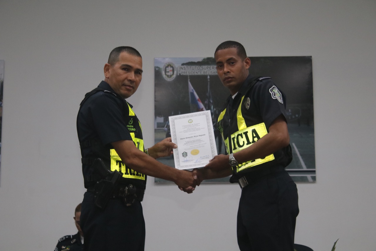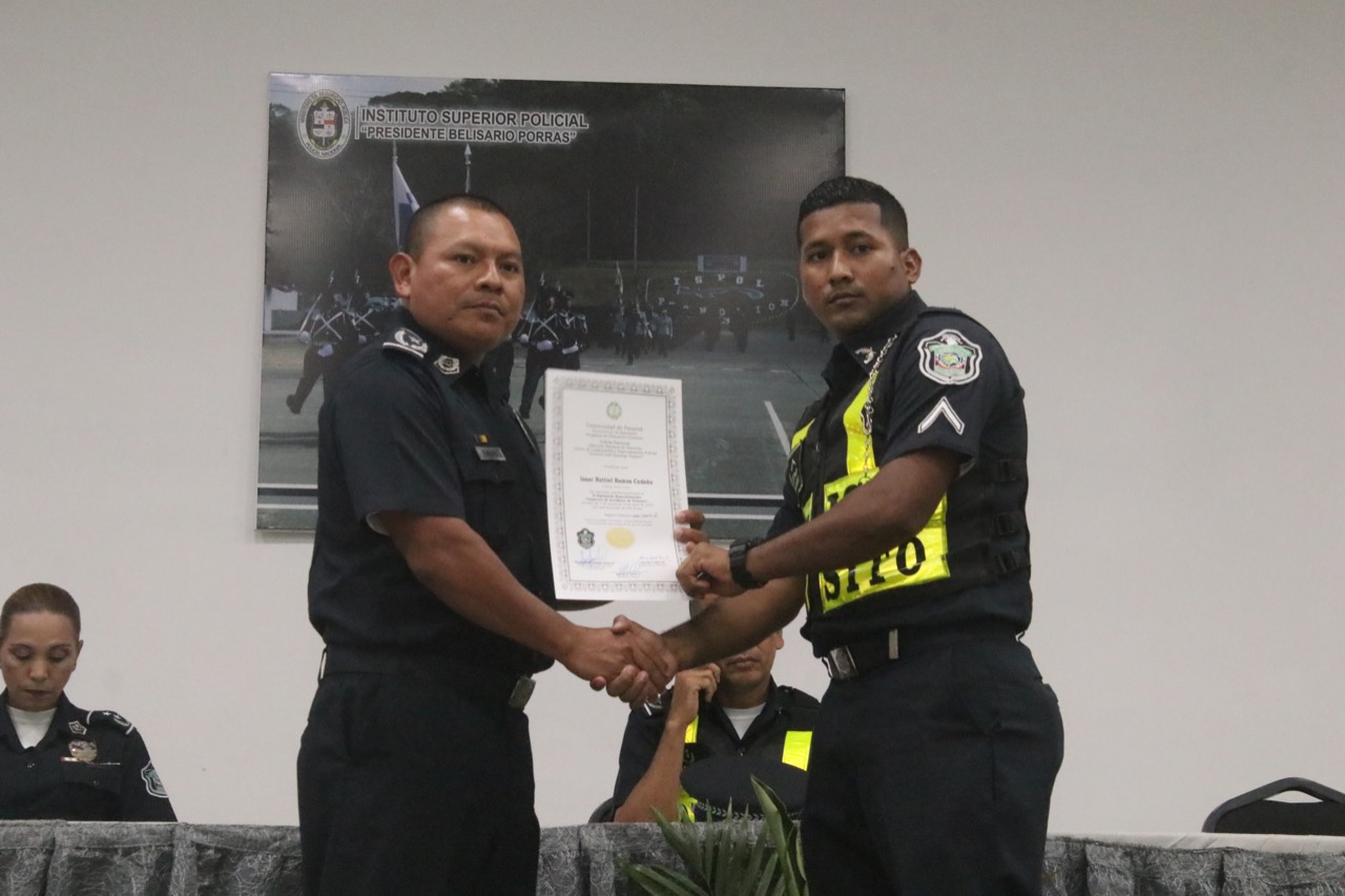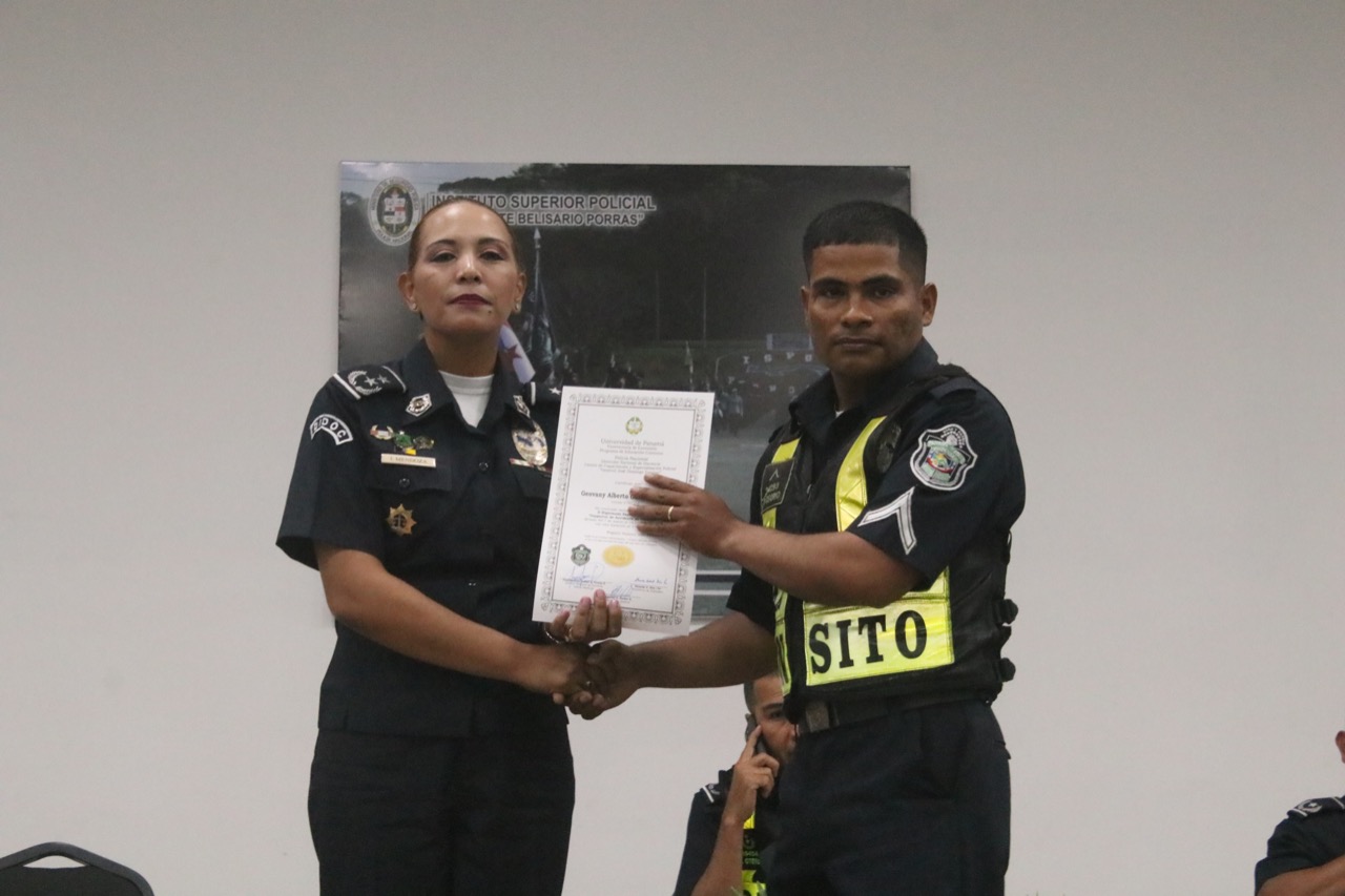 El Subcomisionado Emiliano Otero, Director Nacional de Operaciones del Tránsito, la Subcomisionada Irán de Muy, jefa del Centro de Capacitación de la Policía Nacional y el Mayor Bienvenido Méndez del Centro de Capacitación de la Policía Nacional fueron los encargados de realizar la entrega de certificados a los uniformados.