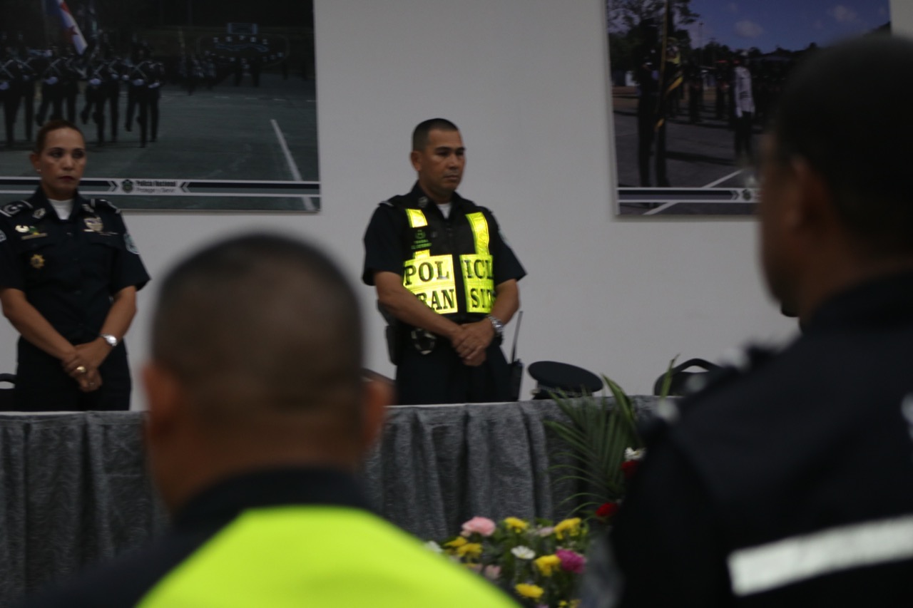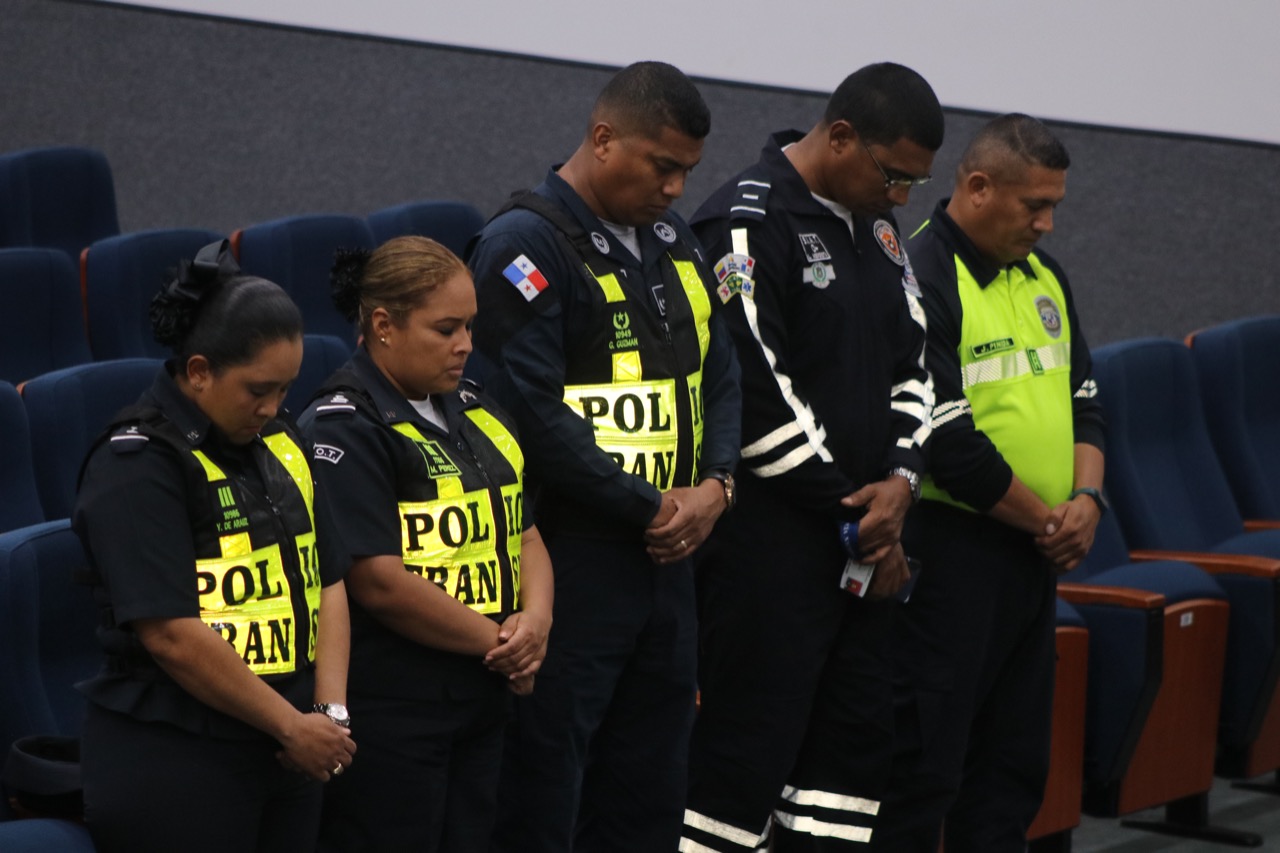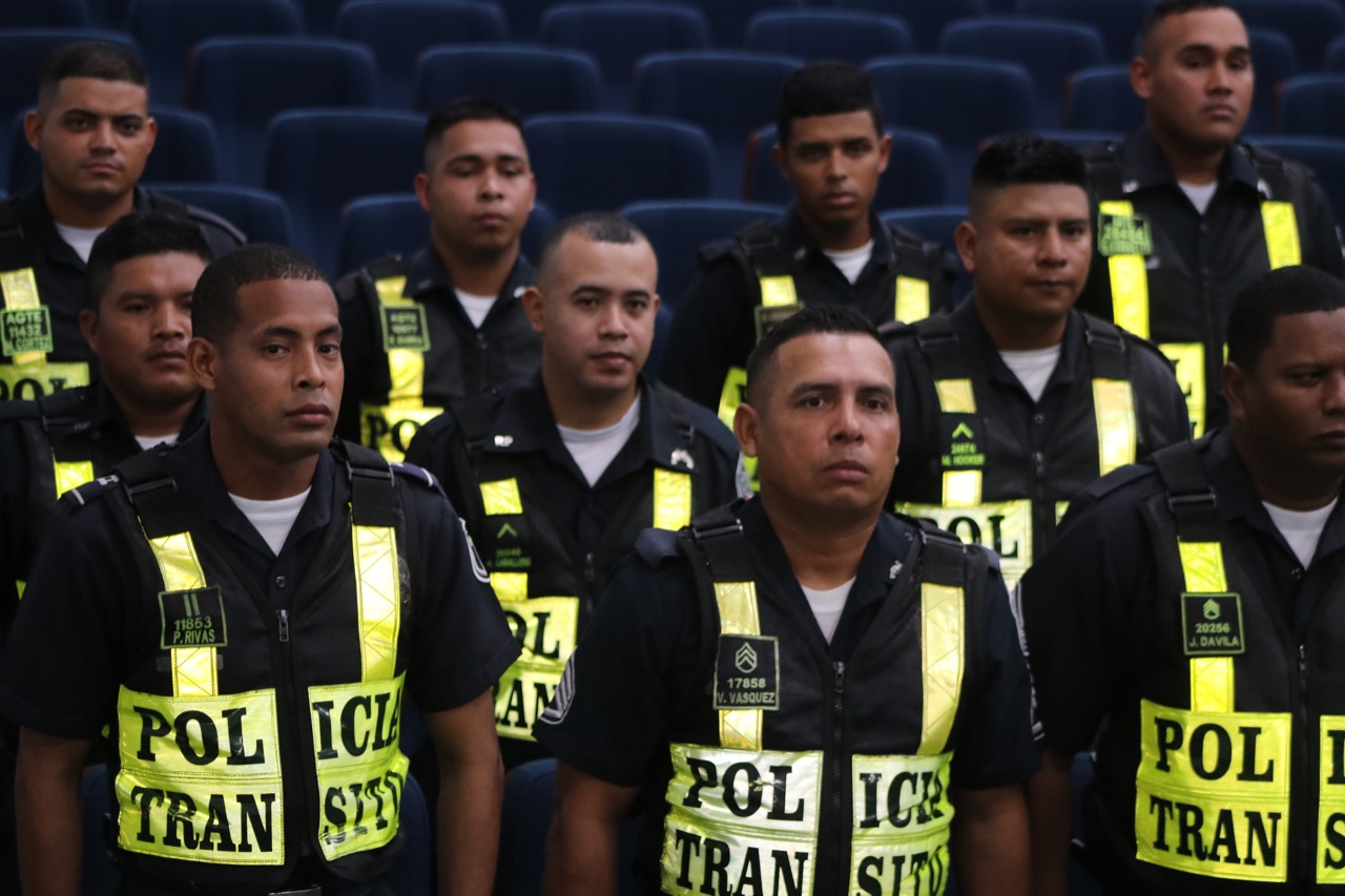 El Subcomisionado Emiliano Otero, Director Nacional de Operaciones del Tránsito, la Subcomisionada Irán de Muy, jefa del Centro de Capacitación de la Policía Nacional y el Mayor Bienvenido Méndez del Centro de Capacitación de la Policía Nacional fueron los encargados de realizar la entrega de certificados a los uniformados.