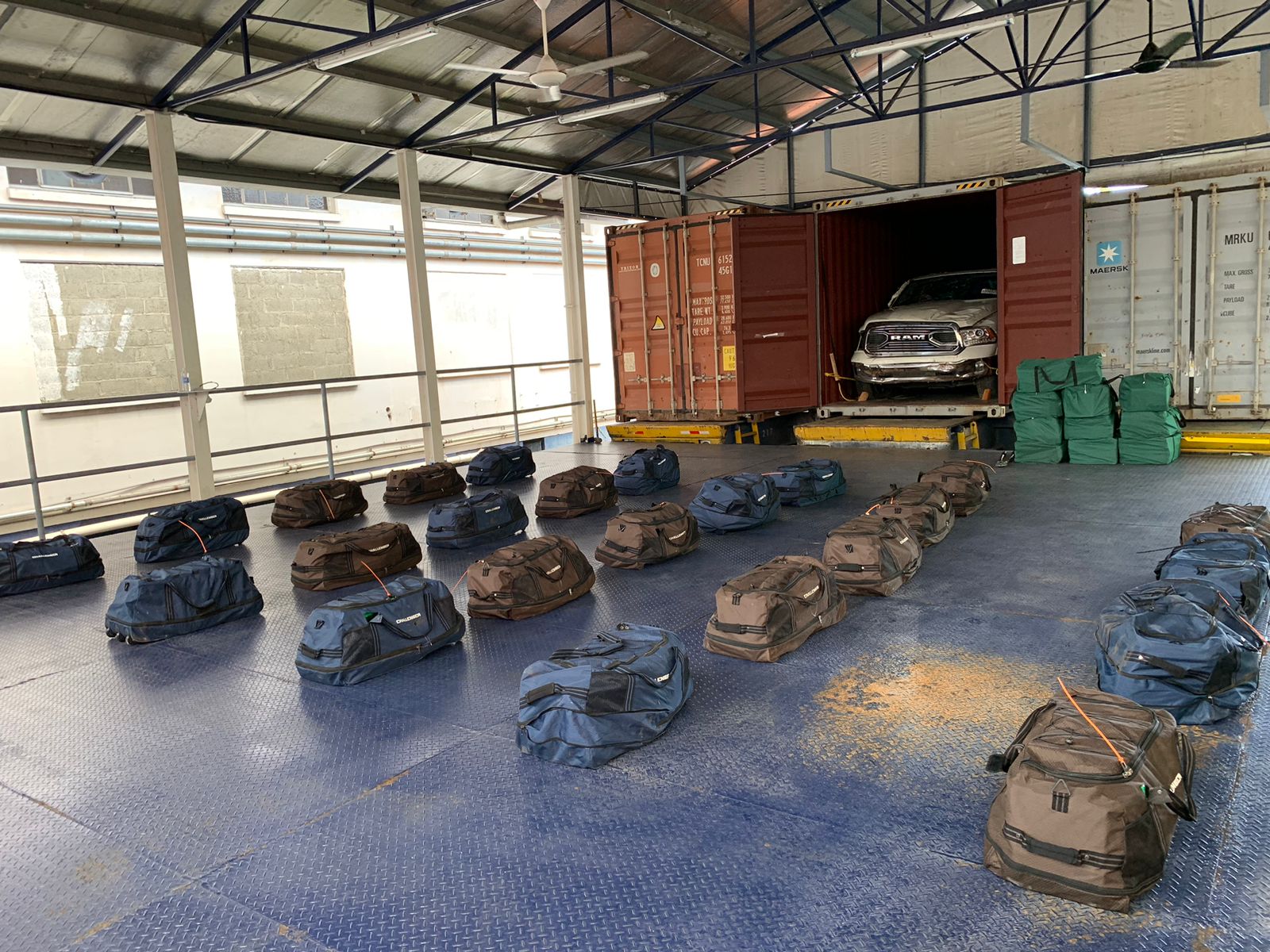 Las unidades de la Dirección Nacional Antidrogas en medio de las inspecciones ubican en el primer contenedor 10 maletines de color verde que al ser verificado dan con el hallazgo de 445 paquetes de presunta sustancia ilícita.