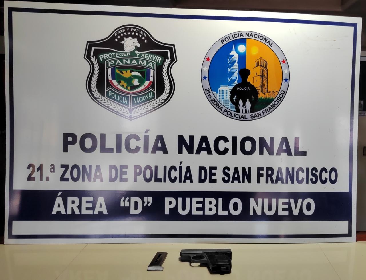 Unidades de la ronda policial en Pueblo Nuevo, logran la aprehensión de un ciudadano de 21 años de edad, en posesión ilegal de un arma de fuego, informó el Subcomisionado Edgardo Núñez, Ejecutivo de la zona policial de San Francisco. Su aprehensión se logra en horas de la tarde de este sábado 21 de enero en la Avenida 12 de octubre. Al sospechoso se le decomisa una pistola con un proveedor de color plata. Tanto el sospechoso como la evidencia fueron puestos a órdenes de las autoridades judiciales correspondientes a fin de profundizar las investigaciones de rigor. |