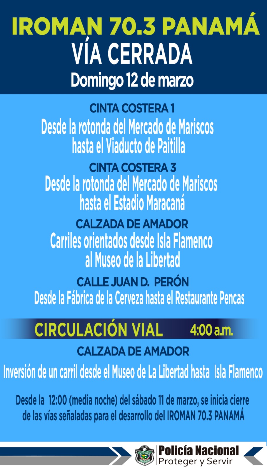La Policía Nacional, a través de la Dirección Nacional de Operaciones de Tránsito mantendrá un dispositivo para garantizar la seguridad vial de los participantes, visitantes y conductores en general, con motivo de la Carrera Ironman. Desde inició de la madrugada de este domingo 12 marzo se realizará los desvíos e inversión de carriles en la Calzada de Amador y la Cinta Costera 1 y 3. El Subteniente Rodney Robinsón explicó que en esta inversión, los carriles de salida de la Calzada de Amador serán para los competidores, mientras que los que normalmente se utilizan para ingresar serán usados uno para la entrada y el otro para la salida de los vehículos en la Calzada de Amador. Se invertirán los carriles en una ruta desde Isla Flamenco hasta el Museo. También se mantendrá cerrada la Cinta Costera sin embargo se habilitará la Avenida Balboa para el libre tráfico vehicular. A lo largo de la Cinta Costera y La Calzada de Amador se mantendrán las unidades policiales para orientar a los conductores. |