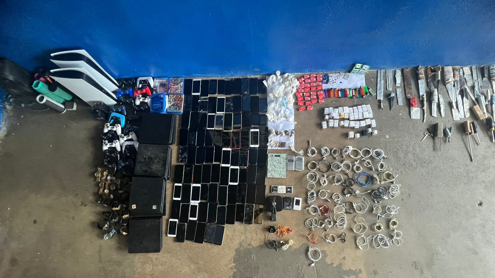Unidades policiales de Servicio en la Seguridad Penitenciaria, realizaron una requisa en la cárcel de Nueva Esperanza, en Colón donde incautaron presunta droga, pesas digitales, celulares y hasta bebidas fermentadas. Se ubicaron seis envoltorios con marihuana, 14 con cocaína, 86 teléfonos celulares, tres router, 25 reloj, 35 cabezotes de cargadores y 44 cables USB. Igualmente se encontraron cuatro audífonos, 17 encendedores, tres baterías de celulares, 25 chips de celulares, una memoria USB, 44 objetos punzo cortantes, 15 hojas de feeling, 10 bocinas inalámbricas y 35 galones de bebidas fermentada. Además se hallaron nueve consolas, discos de juegos, dos cajas de cigarrillos y tres pesas digitales. |